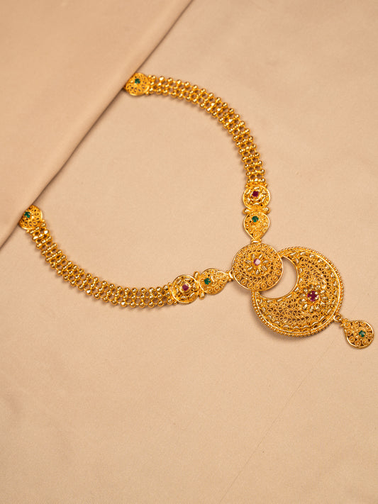 Temple-Inspired Antique Gold Necklace with Intricate Filigree Pendant