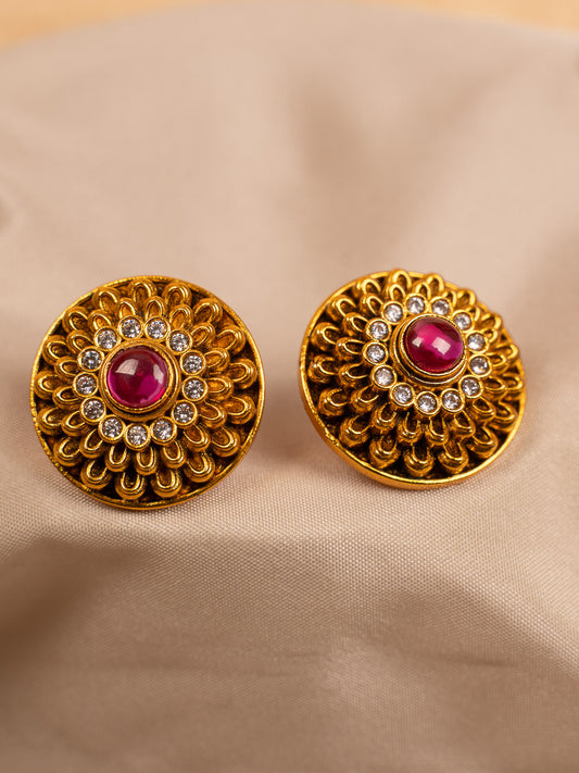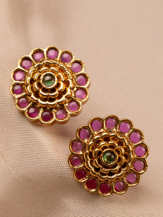 Gold-Toned Floral Stud Earrings with Ruby Center & CZ Detailing