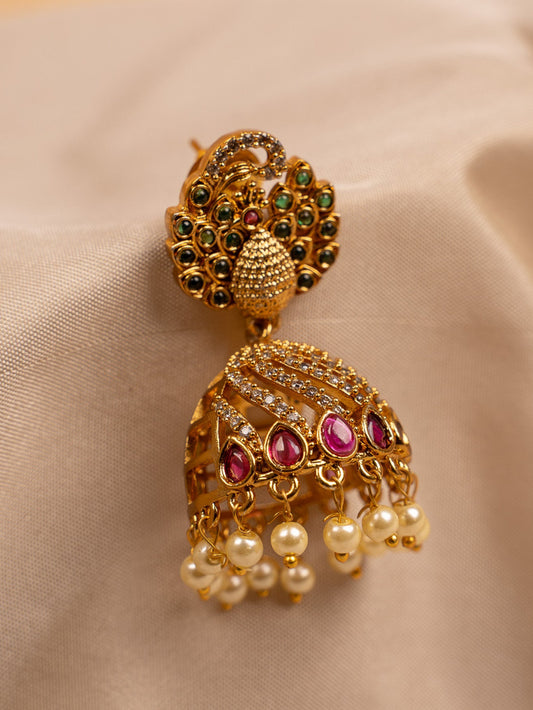 Peacock-Inspired Gold Jhumka Earrings with Pearl Drops