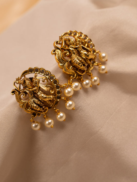 Antique Gold Radha Krishna Temple Earrings with Pearl Drops