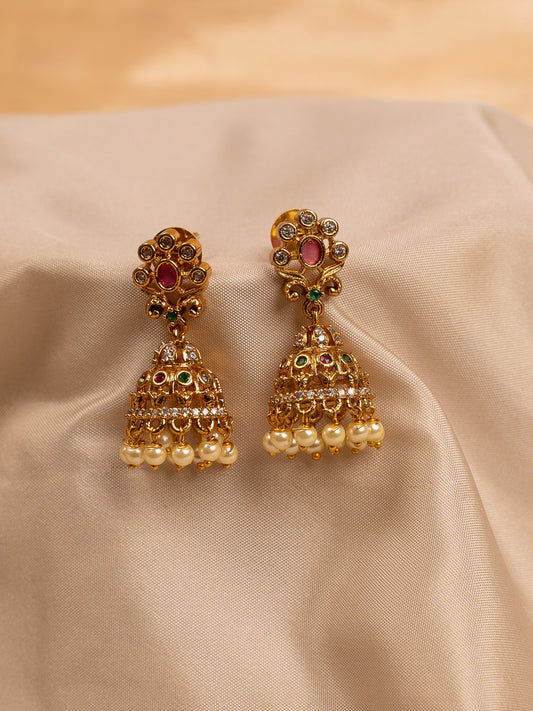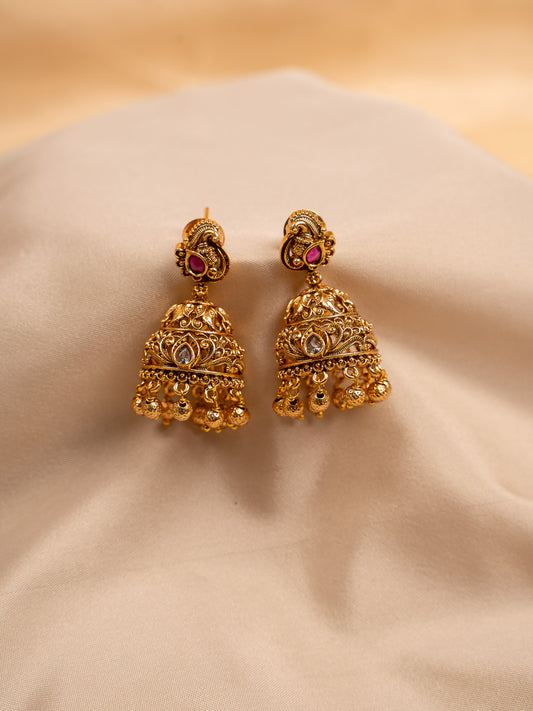 Antique Gold Jhumka Earrings with Ruby & White Stones
