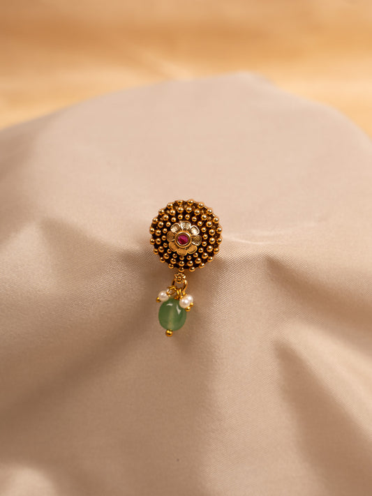 Antique Gold Stud Earrings with Green Beads & Pearl Drops