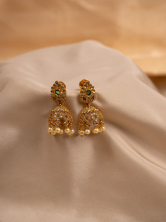 Classic Gold Jhumka Earrings with Pearl Drops & CZ Stones