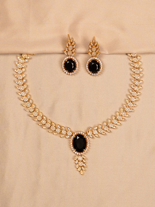 Black Stone & CZ Leaf Necklace Set with Matching Earrings