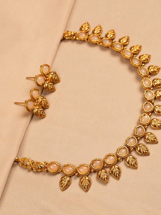 Antique Gold Leaf Necklace Set with Cream Stone Detailing