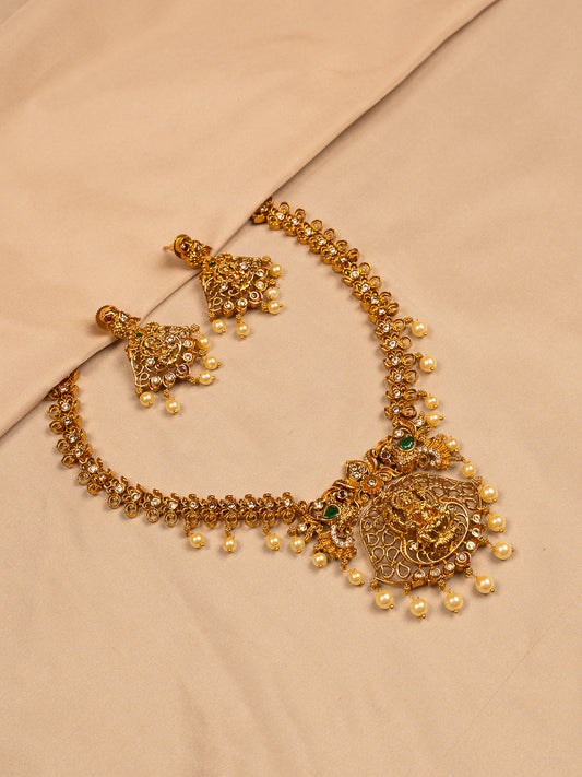 Lakshmi Antique Gold Temple Necklace Set with Pearls and Earrings