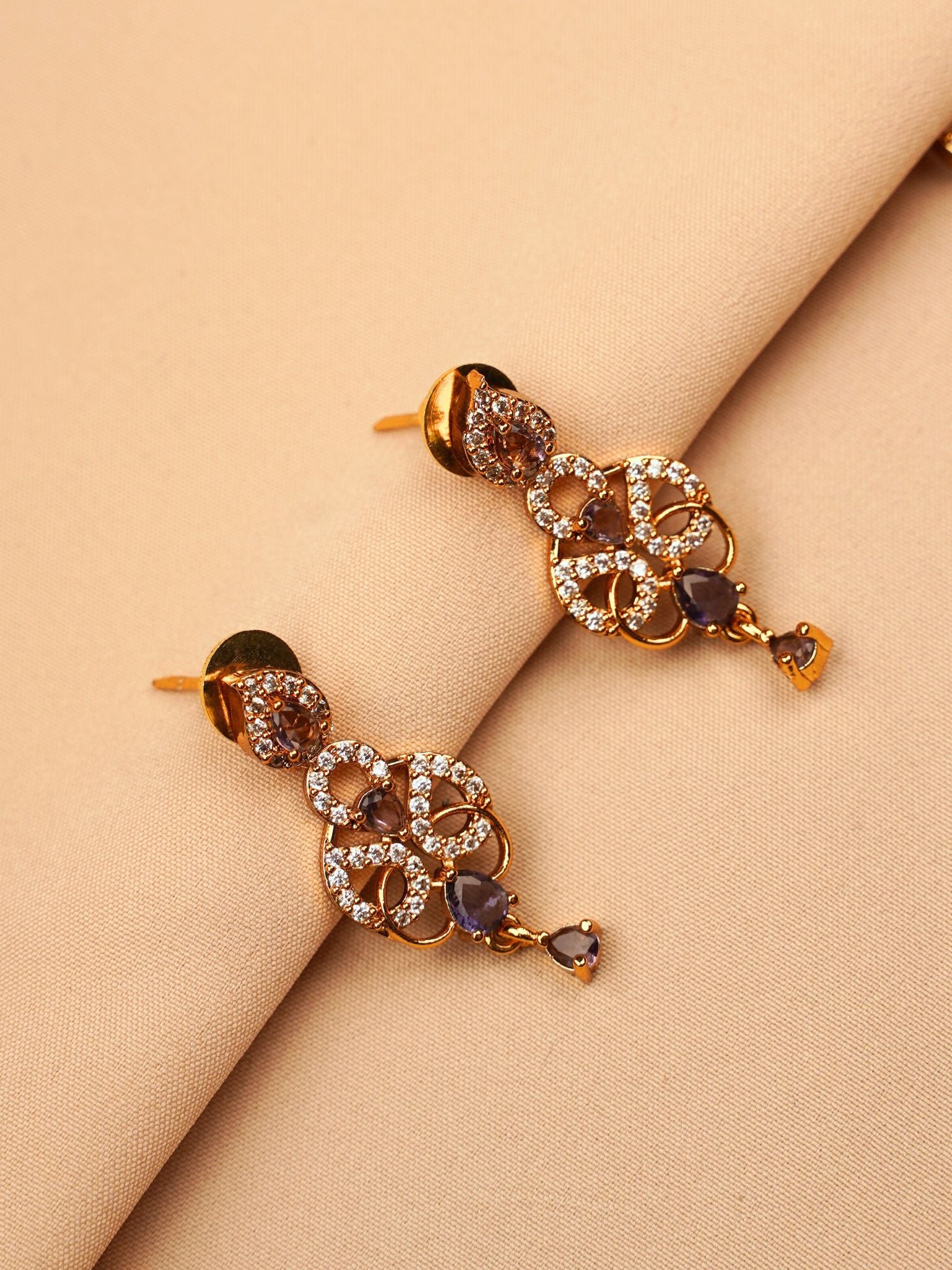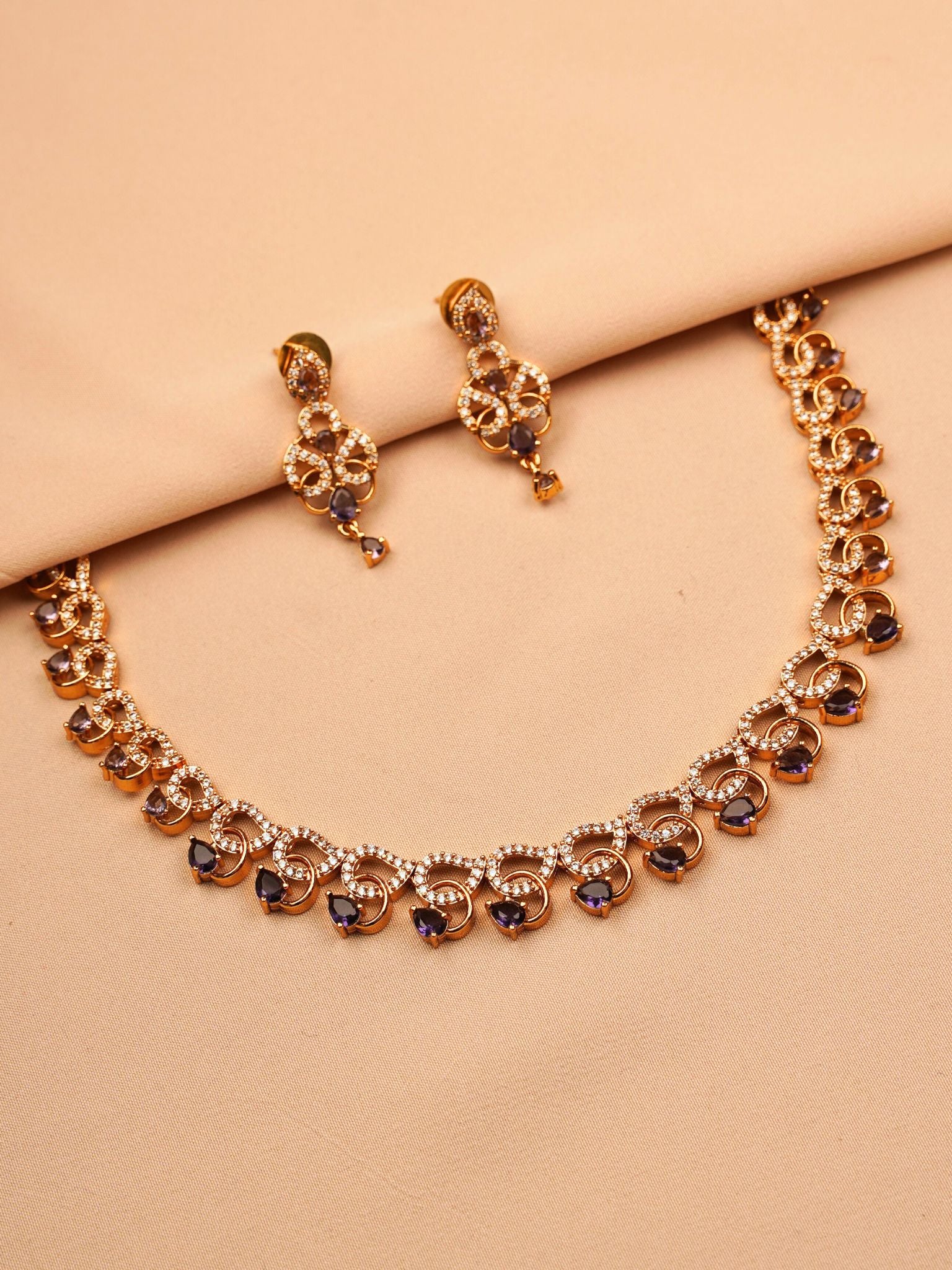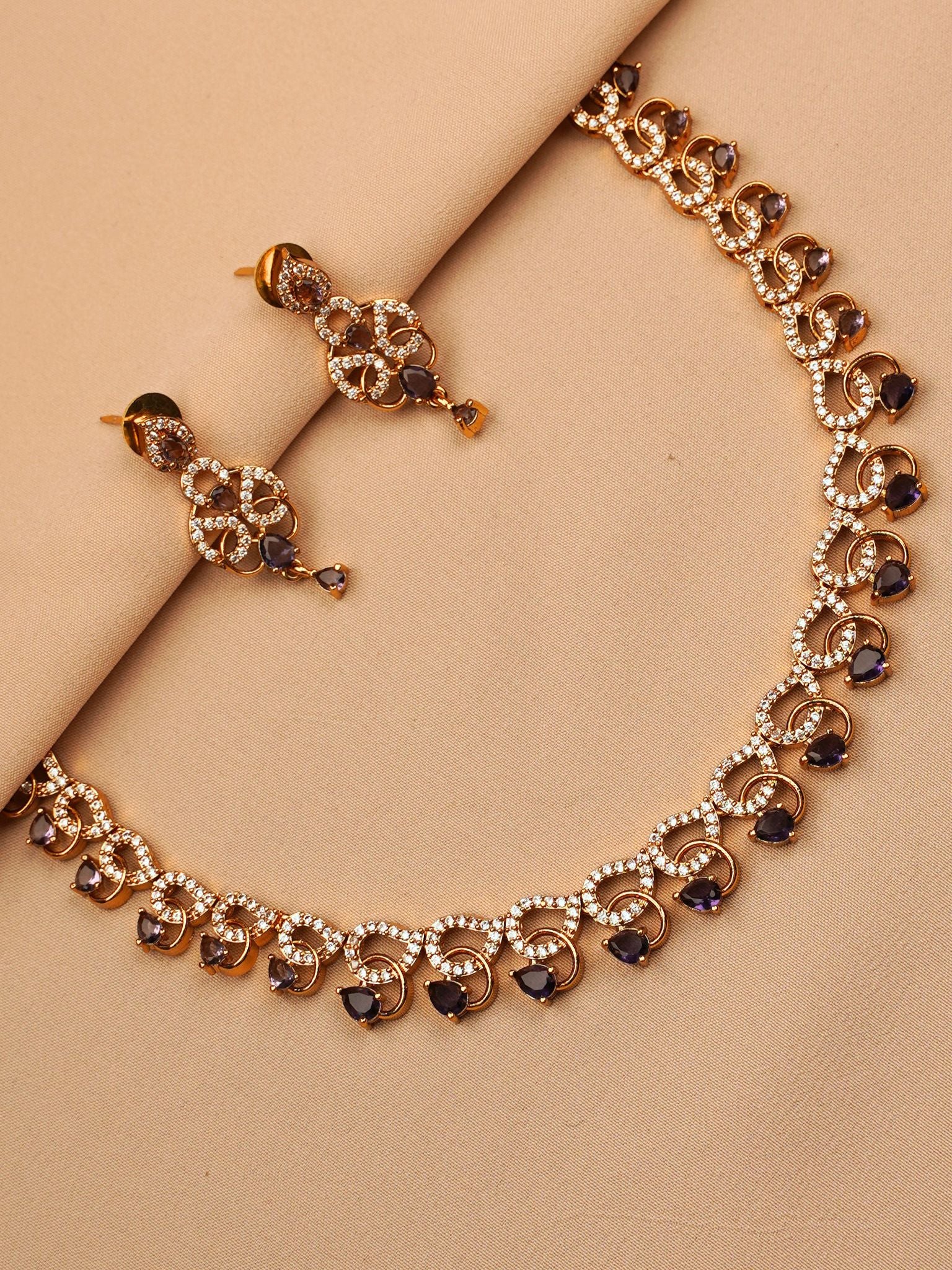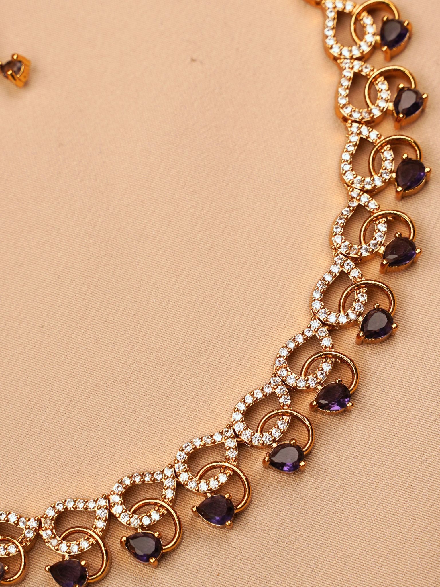 Our Amethyst Lace Necklace Set is designed for women who love understated elegance. Featuring delicate lace-inspired loops adorned with deep amethyst teardrop stones and sparkling CZ crystals, this necklace gives a refined and royal finish to any outfit.