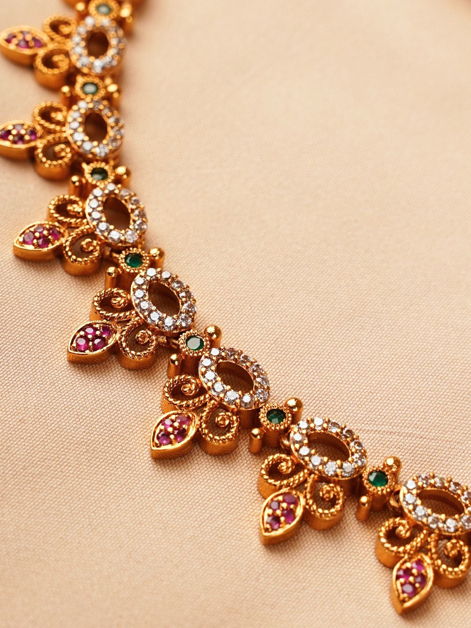 Designed with oval crystal stones highlighted by ruby pink drops and emerald green accents in a floral temple-inspired pattern, this piece brings rich heritage beauty without feeling heavy or overpowering. It pairs beautifully with silk sarees, kasavu, Kanchipuram and bridal lehengas, making it a timeless choice for special occasions.