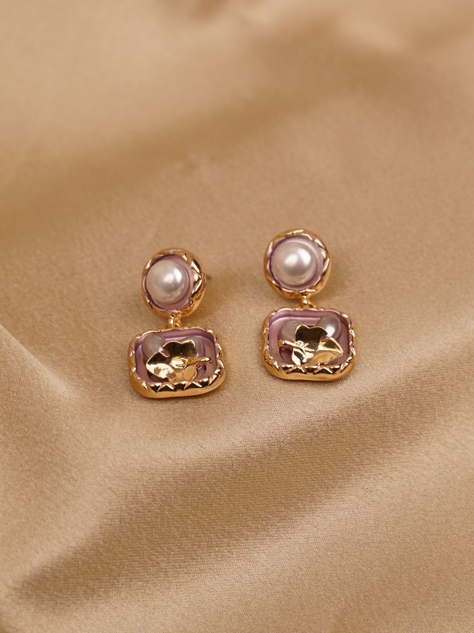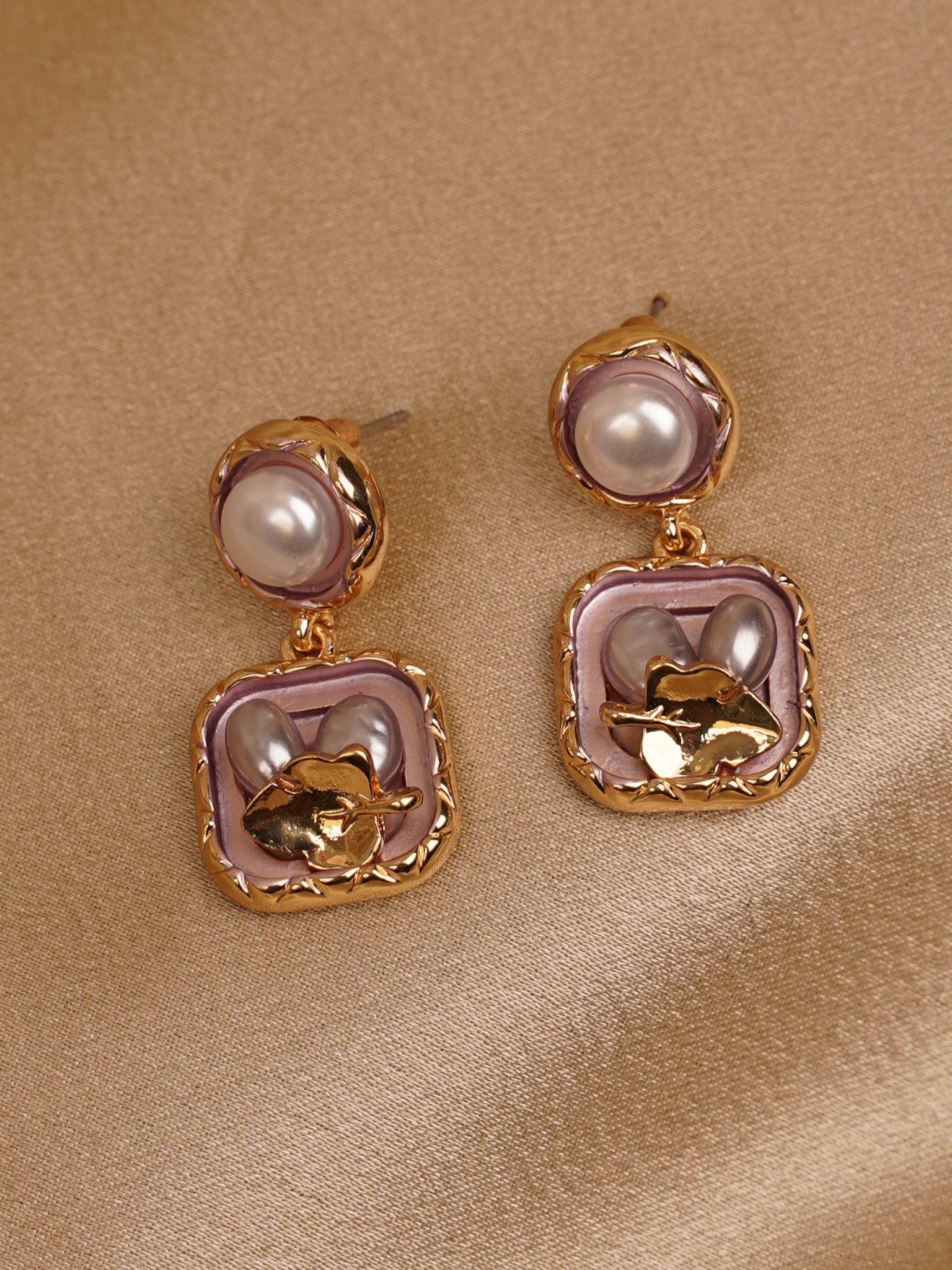 At the center of the square drop rests a sculpted gold dove motif, symbolizing grace and peace. The top stud showcases a classic pearl set in a blush-toned circular frame, creating a cohesive and feminine look.