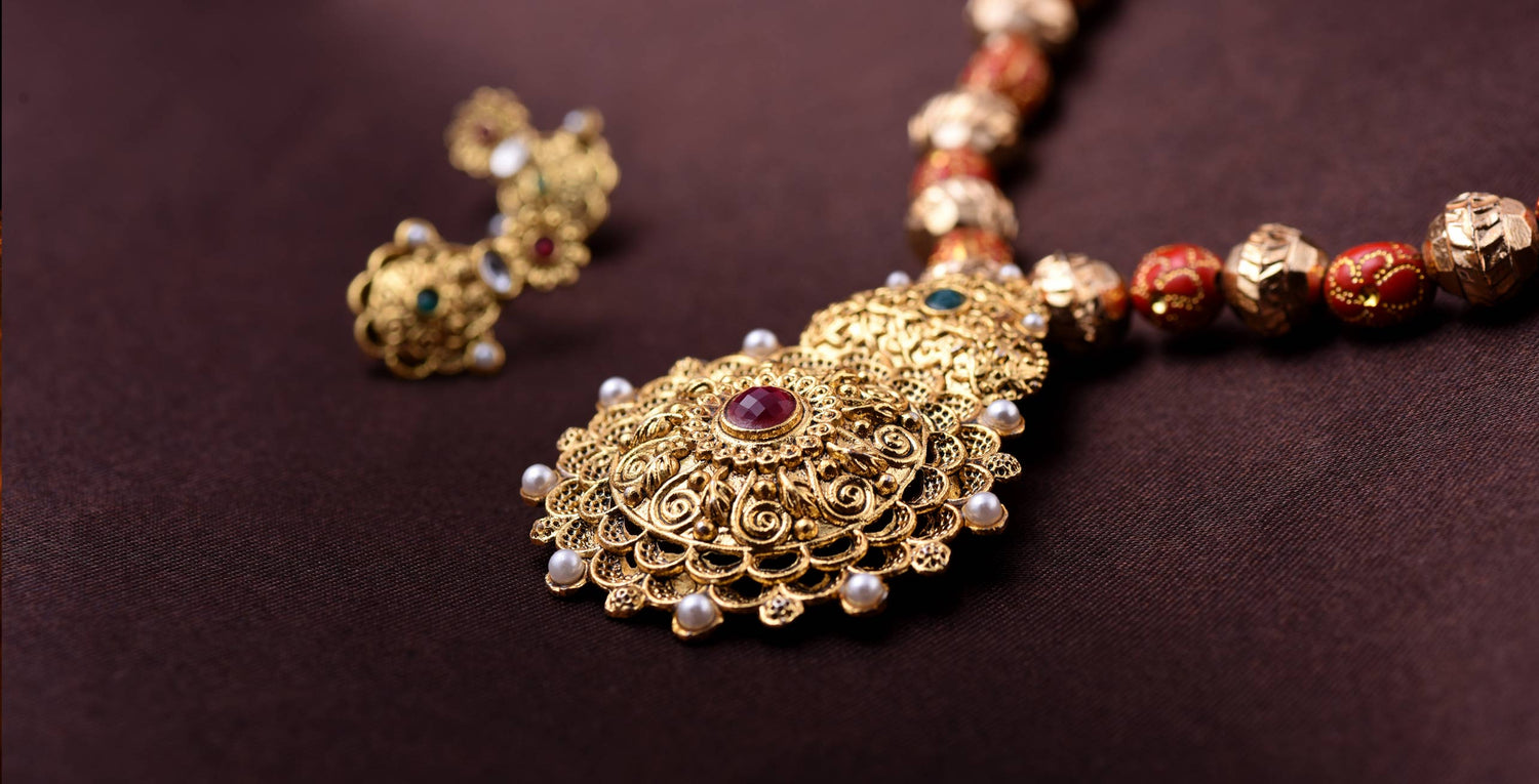 Temple-Inspired Antique Gold Necklace with Intricate Filigree Pendant