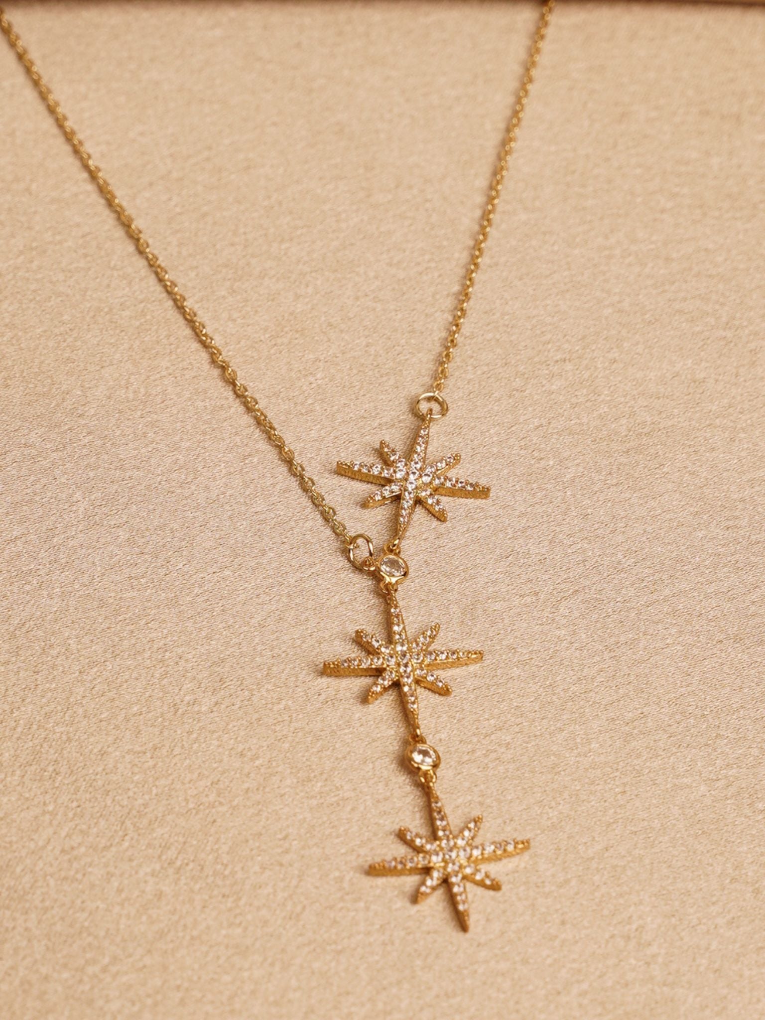 The Celeste Starfall Necklace captures the brilliance of a starlit sky in an elegant cascading design. Crafted with a delicate gold chain, this piece features three radiant starburst motifs arranged in a graceful vertical drop.
