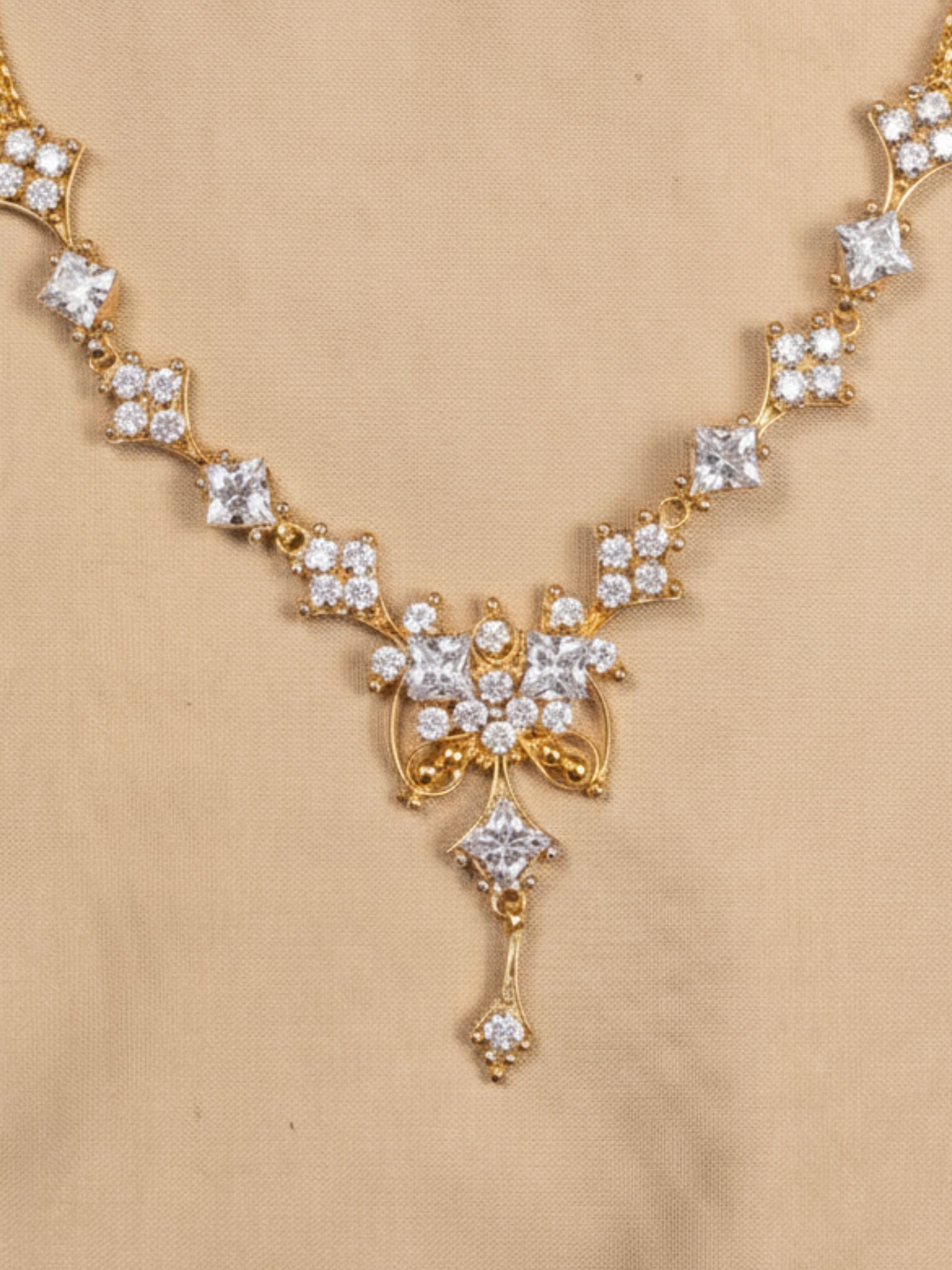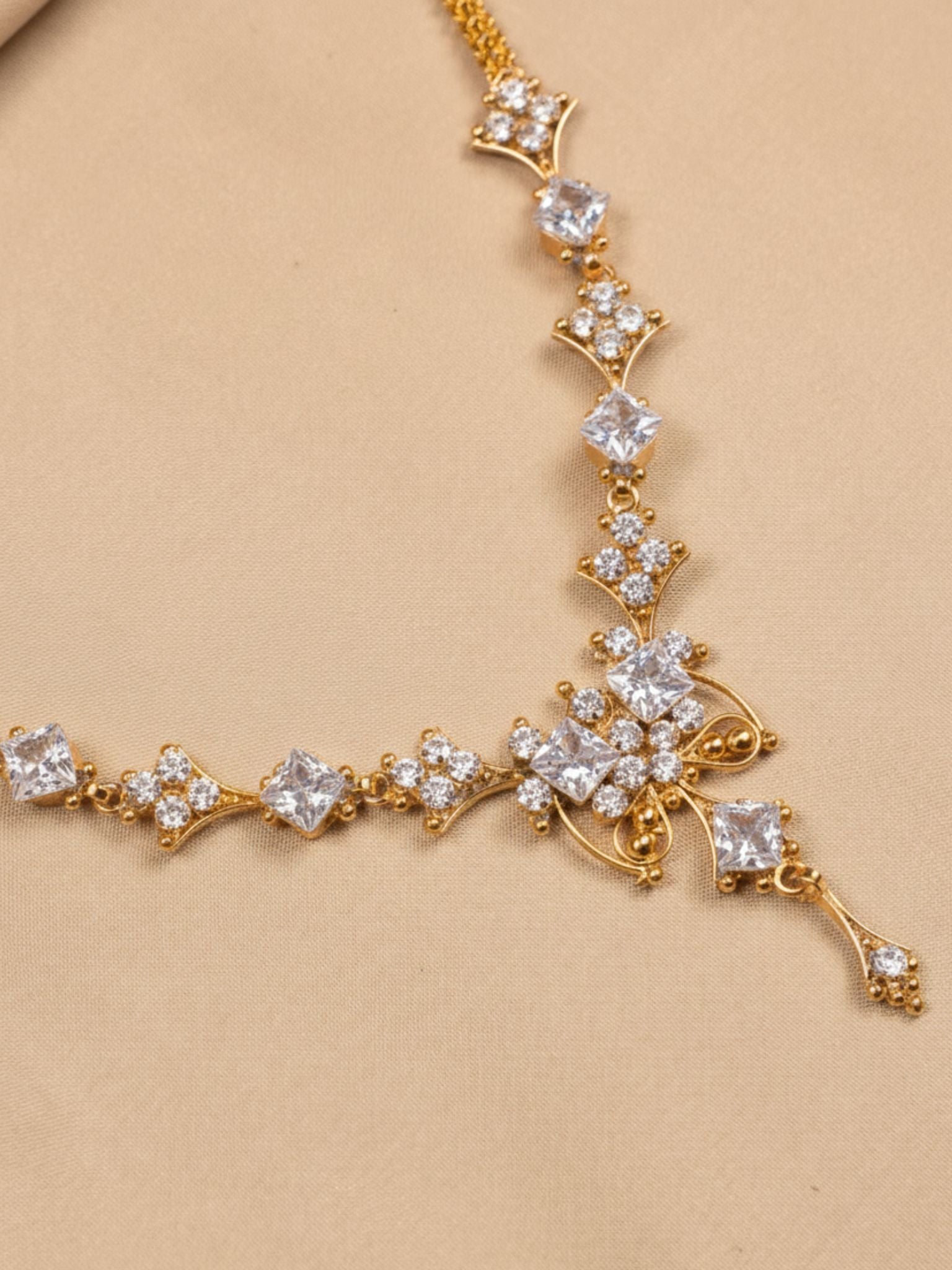 Elevate your elegance with Kaithra’s classic solitaire necklace, beautifully crafted with sparkling clear CZ stones in a modern gold-finish setting. This minimalist design features a delicate arrangement of square and floral-cut stones, balancing contemporary simplicity with timeless charm. Lightweight, versatile, and perfect for daily wear or a special celebration, it adds effortless luxury to sarees, dresses, and fusion outfits. Enjoy premium quality, lasting shine, and a style that speaks sophistication without excess..
