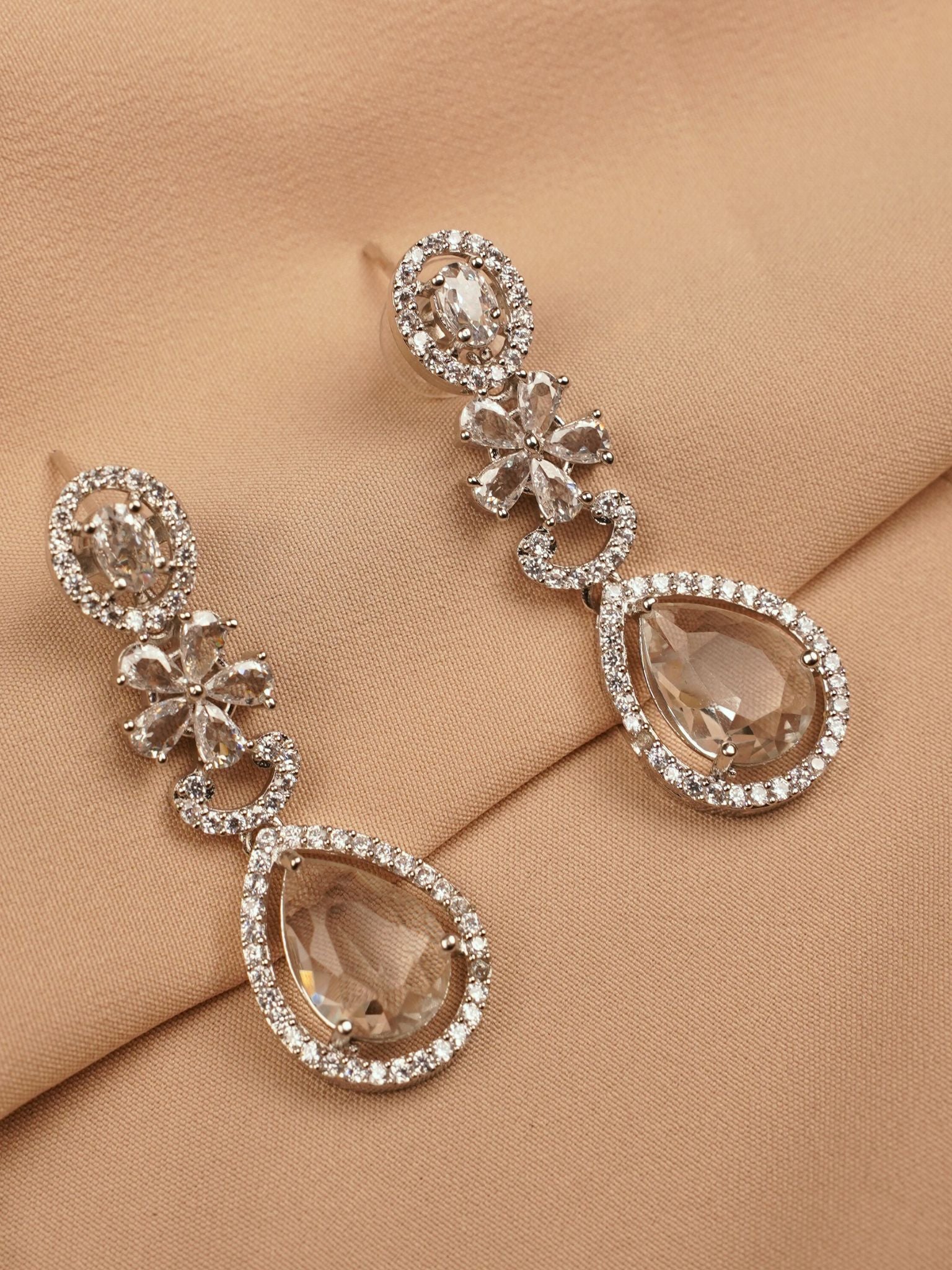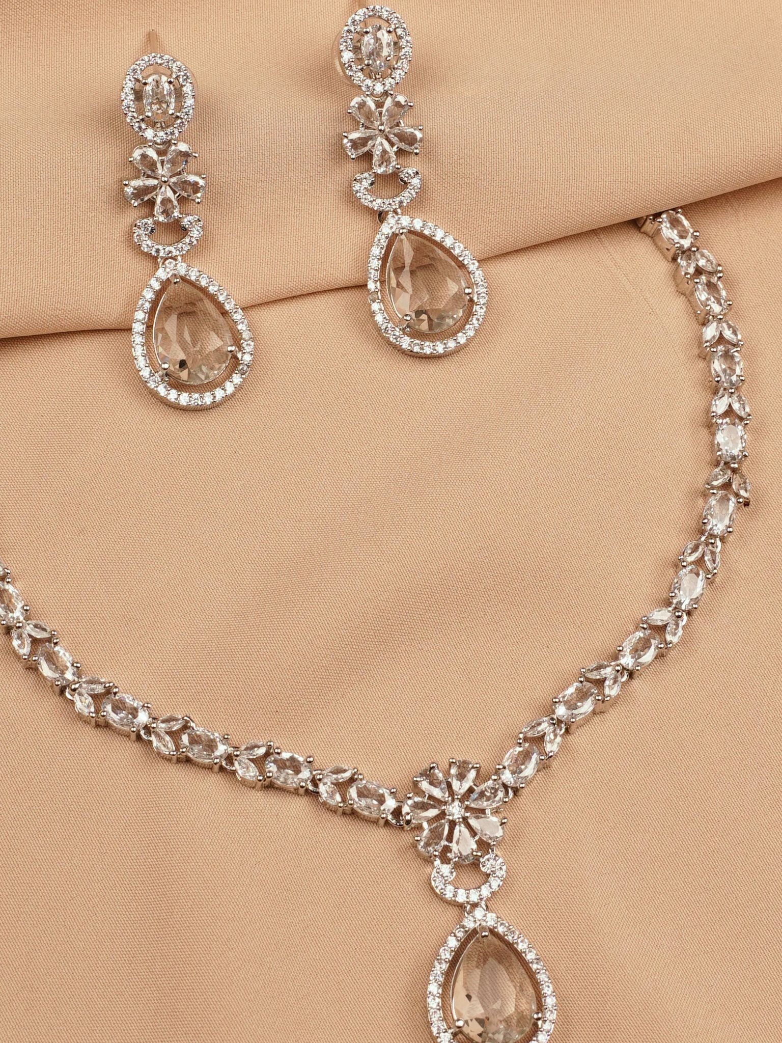 Elevate your elegance with this luxurious Crystal Teardrop Necklace & Earring Set, crafted with a high-shine silver finish and premium graded stones. The necklace features a beautifully linked crystal chain ending in a sparkling teardrop pendant, paired with matching drop earrings designed to frame your face with brilliance.Perfect for weddings, receptions, festive functions, photoshoots, and premium gifting, this set blends modern sophistication with timeless charm.