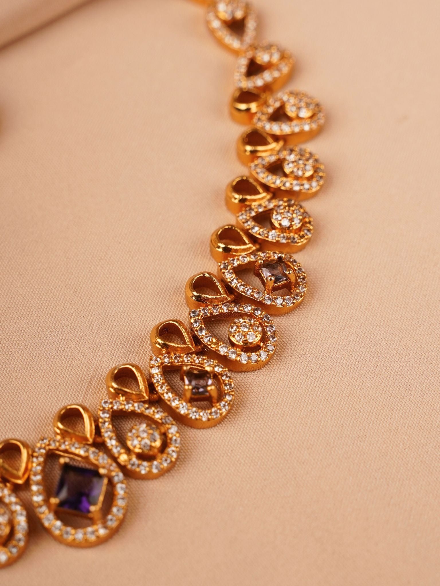 Designed with graceful teardrop-shaped champagne stones framed in fine crystal detailing, this piece brings a subtle glow without feeling heavy or overpowering. It pairs beautifully with sarees, pastel lehengas and elegant gowns, making it perfect for modern celebrations and intimate occasions.