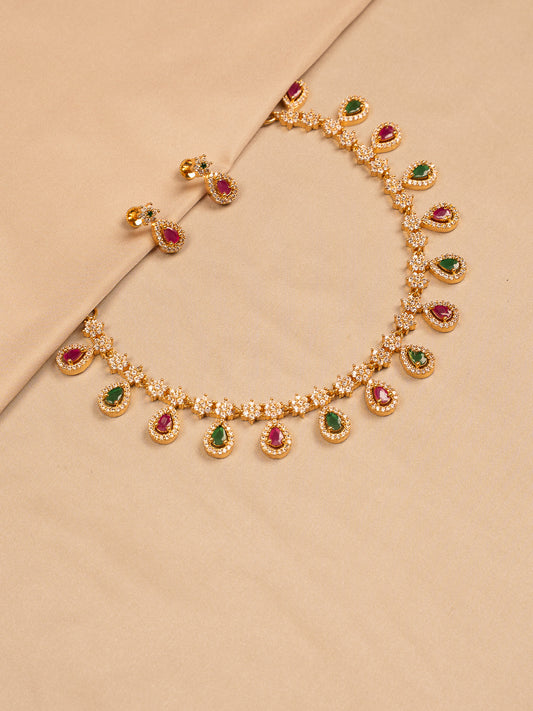Gold Plated Stone Necklace Set with Green & Ruby Teardrop Charms