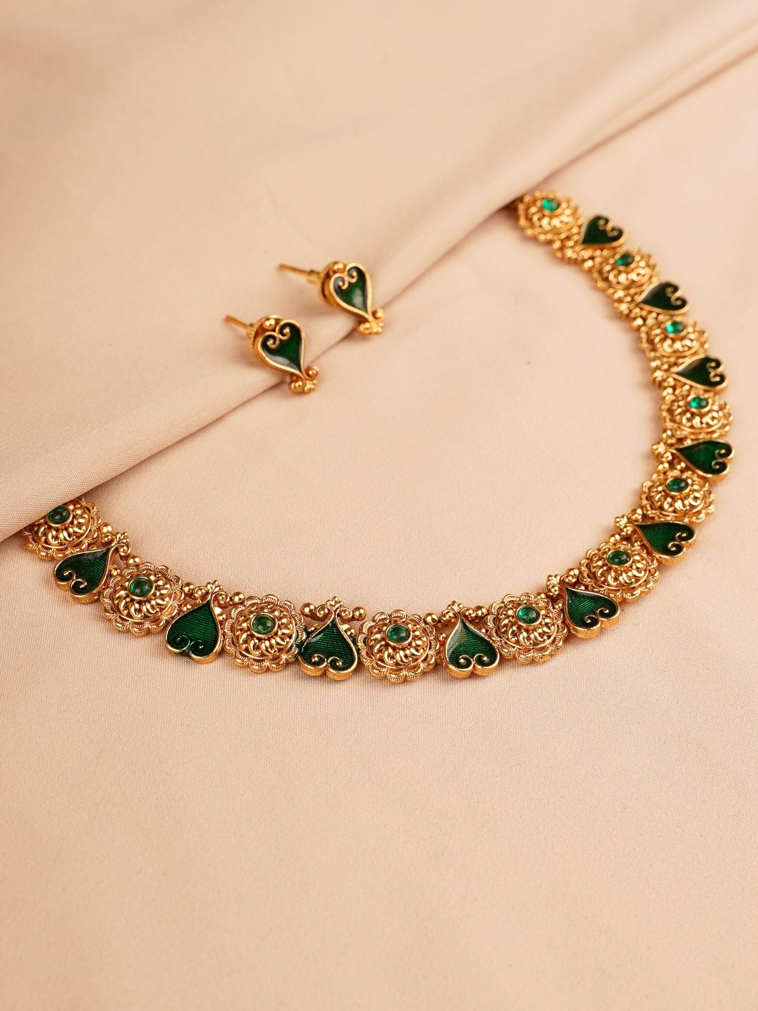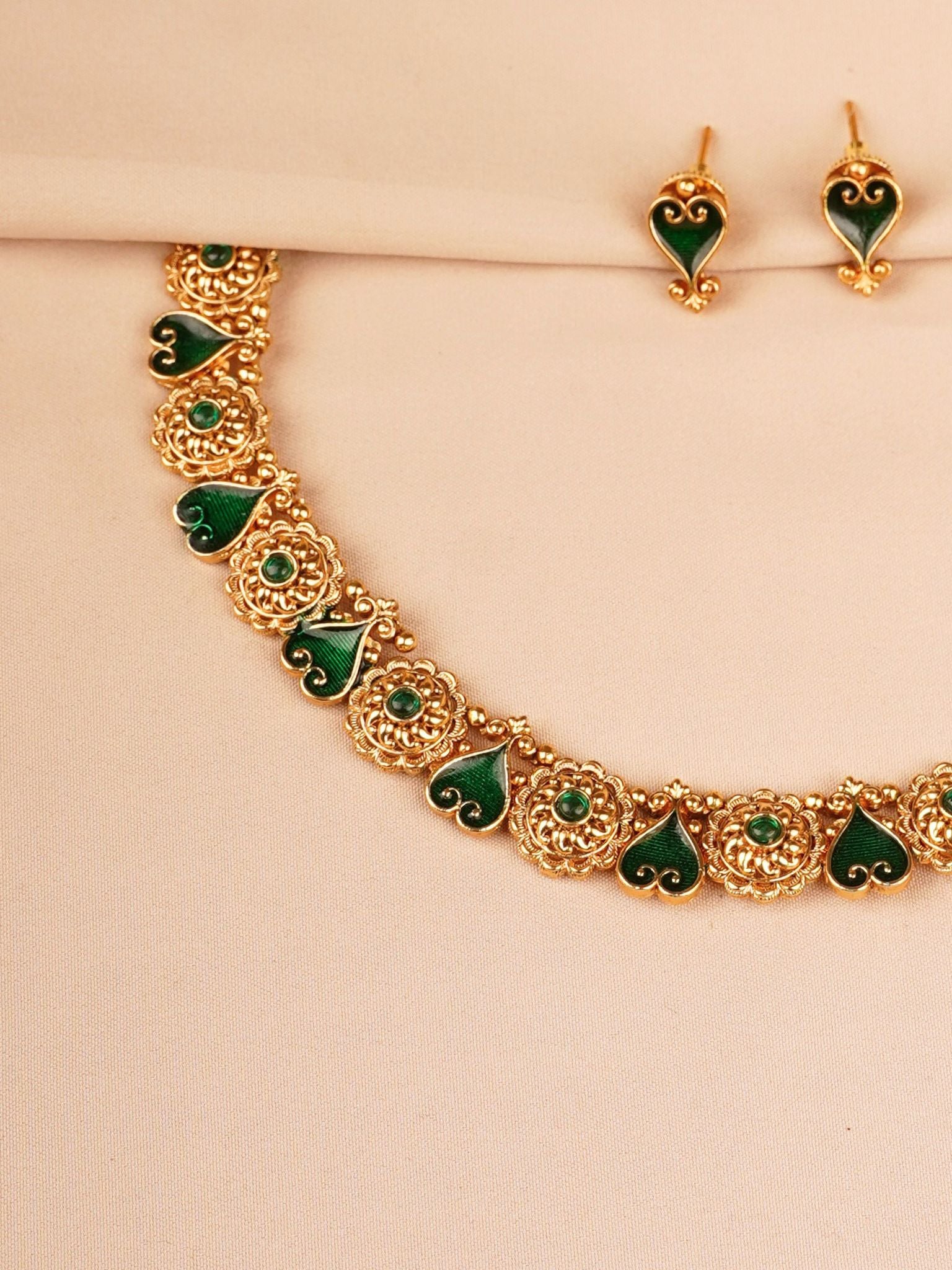 A refined interpretation of traditional temple jewellery, this mat antique gold necklace set features delicately crafted circular motifs paired with graceful emerald green enamel heart-shaped elements. The symmetrical design and soft antique finish create a harmonious balance between heritage craftsmanship and contemporary elegance.