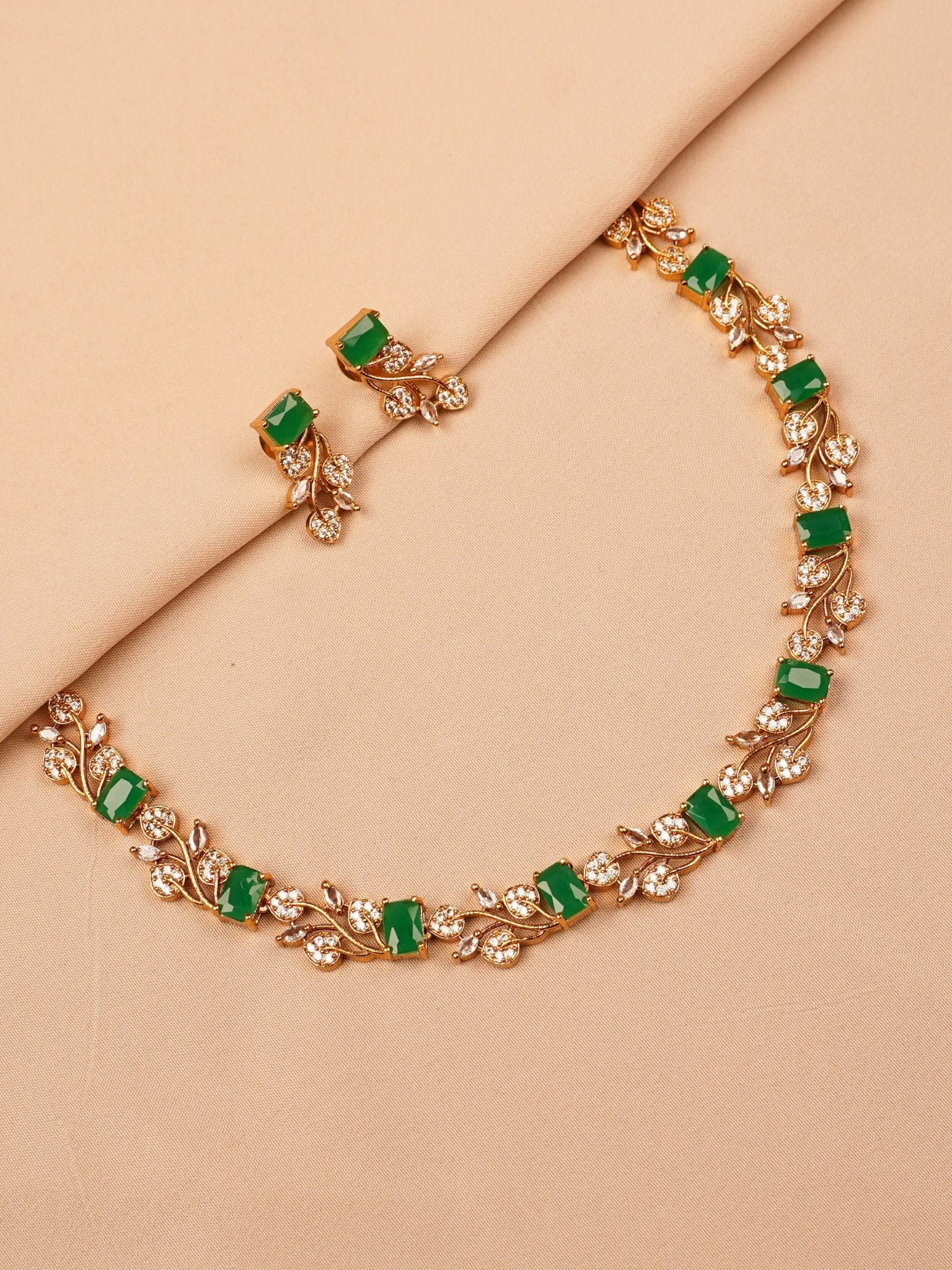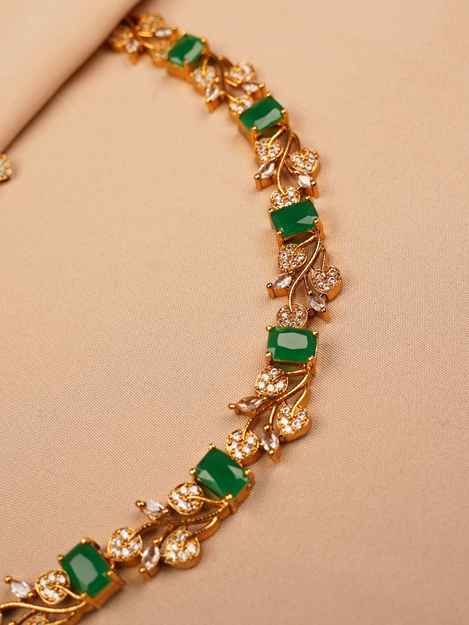 This Emerald Royal Garden Necklace Set features rich green faceted stones framed by delicate floral and leaf motifs. The gold-plated detailing and micro-pave crystals add just the right amount of shine, making this a striking piece for celebrations and special occasions.