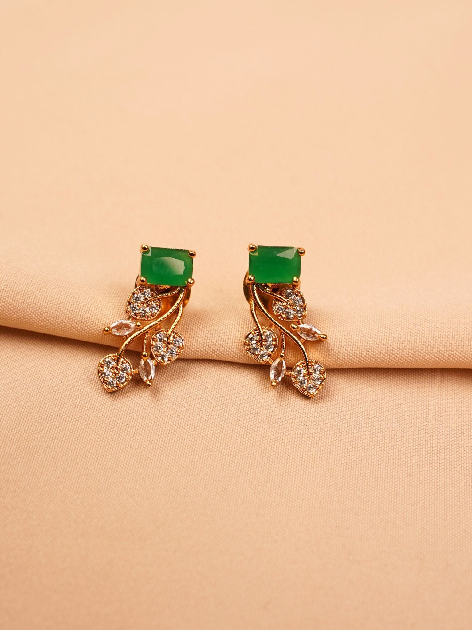 Antique Gold Stud Earrings with Green Beads & Pearl Drops