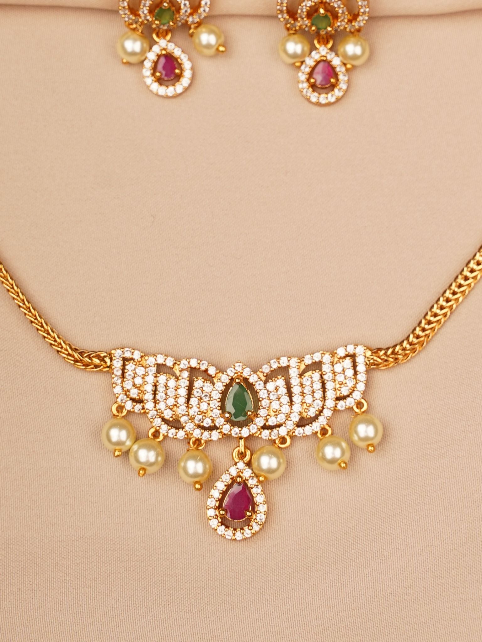 Emerald–Ruby Pearl Drop Necklace & Earrings Set