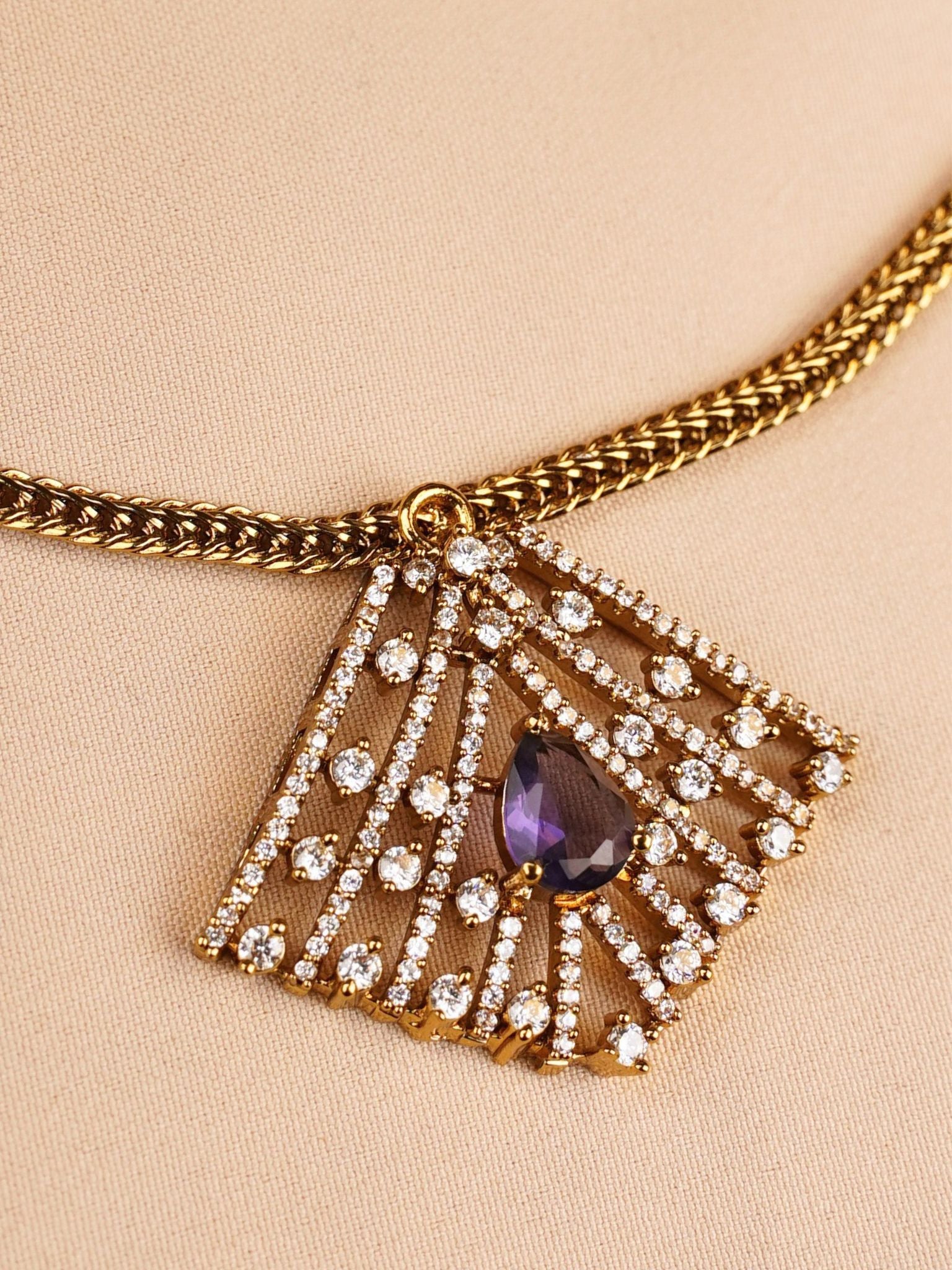A striking blend of contemporary design and refined sparkle, this gold finish necklace set features a sleek geometric pendant crafted with delicate crystal-lined rays, centred around a rich amethyst-toned stone.