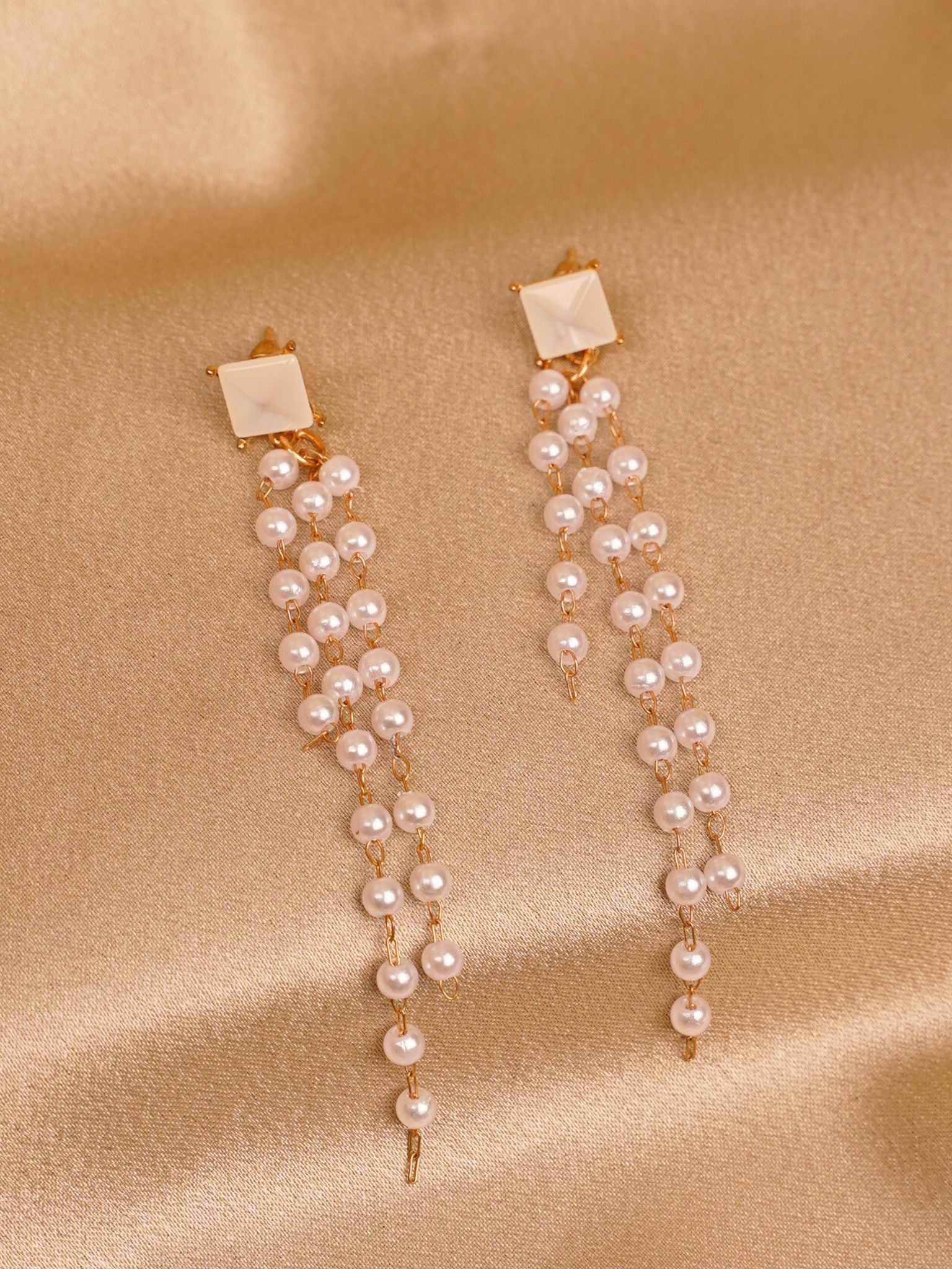 The Ivory Pearl Cascade Earrings are designed for effortless elegance. Featuring a clean ivory square stud with subtle gold prong detailing, the design flows into multiple delicate chains adorned with glossy pearl beads.