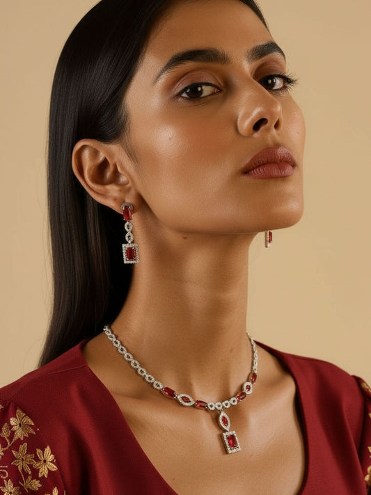 Dual Layer Floral Necklace Set with Ruby Red Drop