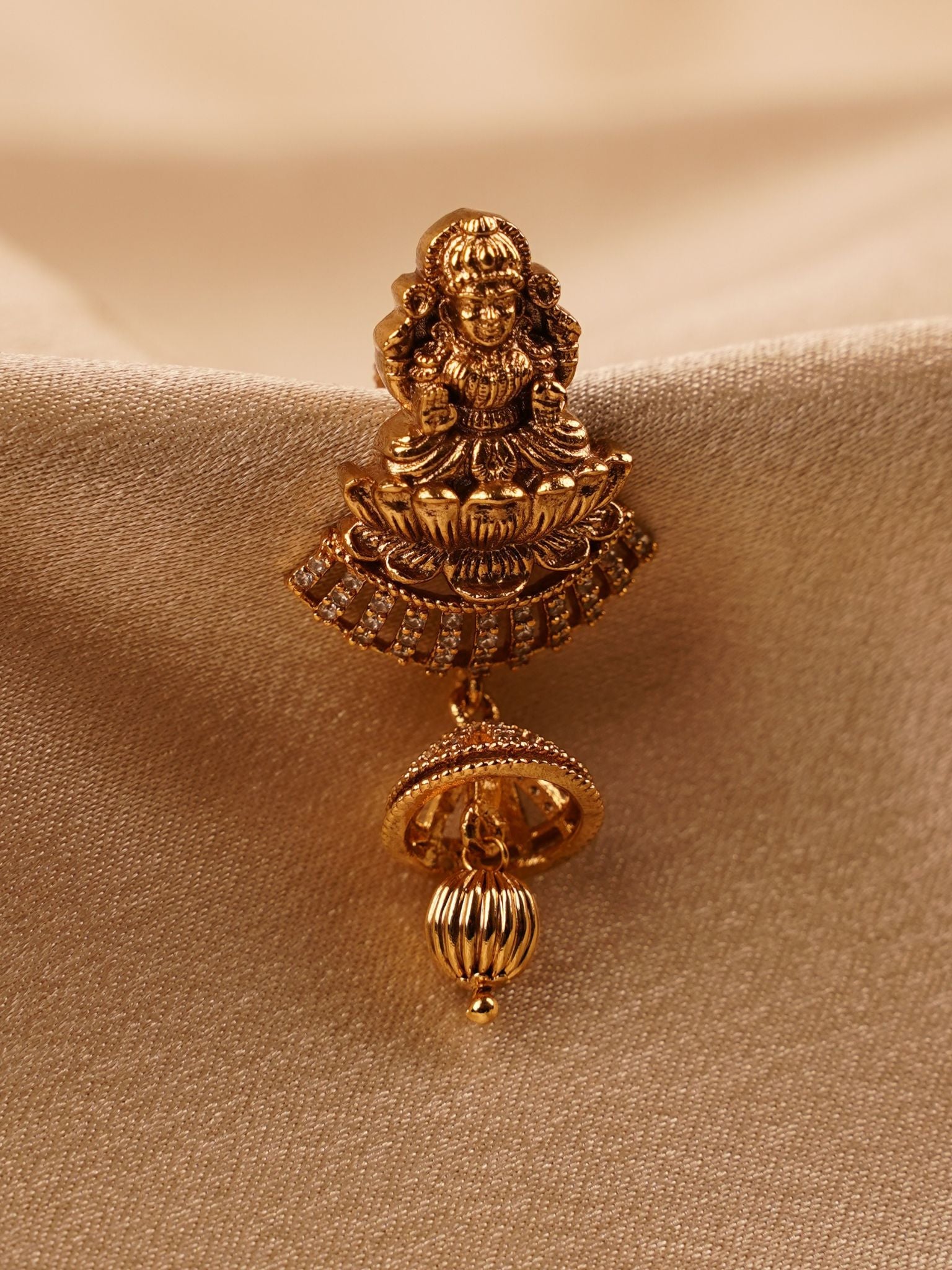The antique gold finish enhances the temple-inspired detailing, while the structured drop element adds movement and balance to the silhouette. Intricate carvings and subtle stone accents give the piece a rich, vintage appeal without overpowering its elegance.