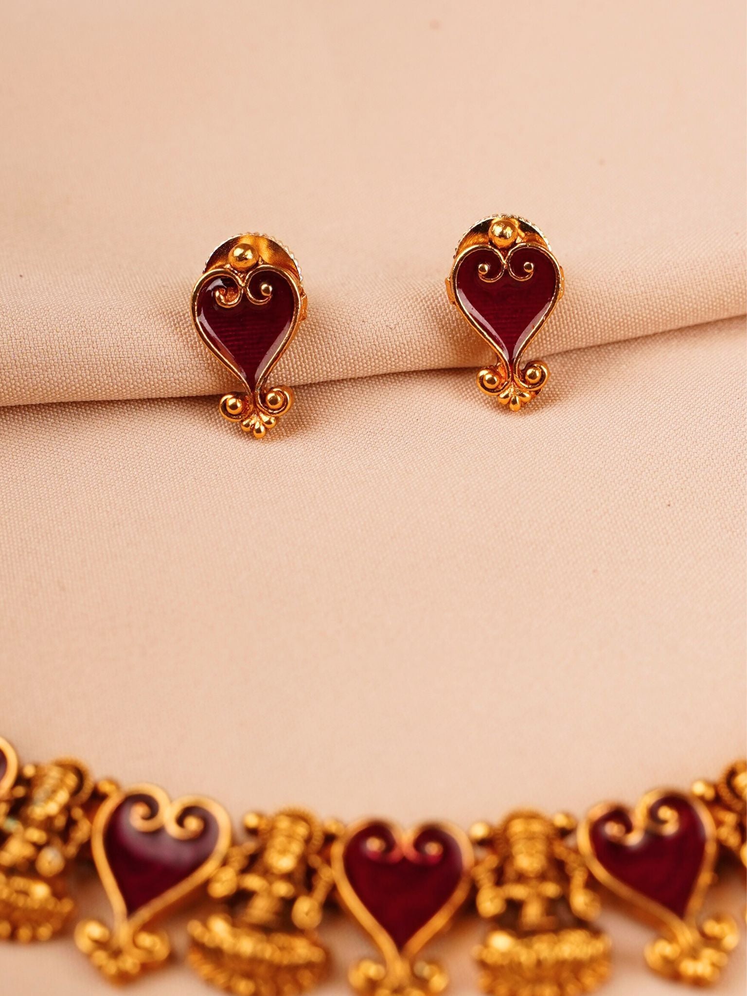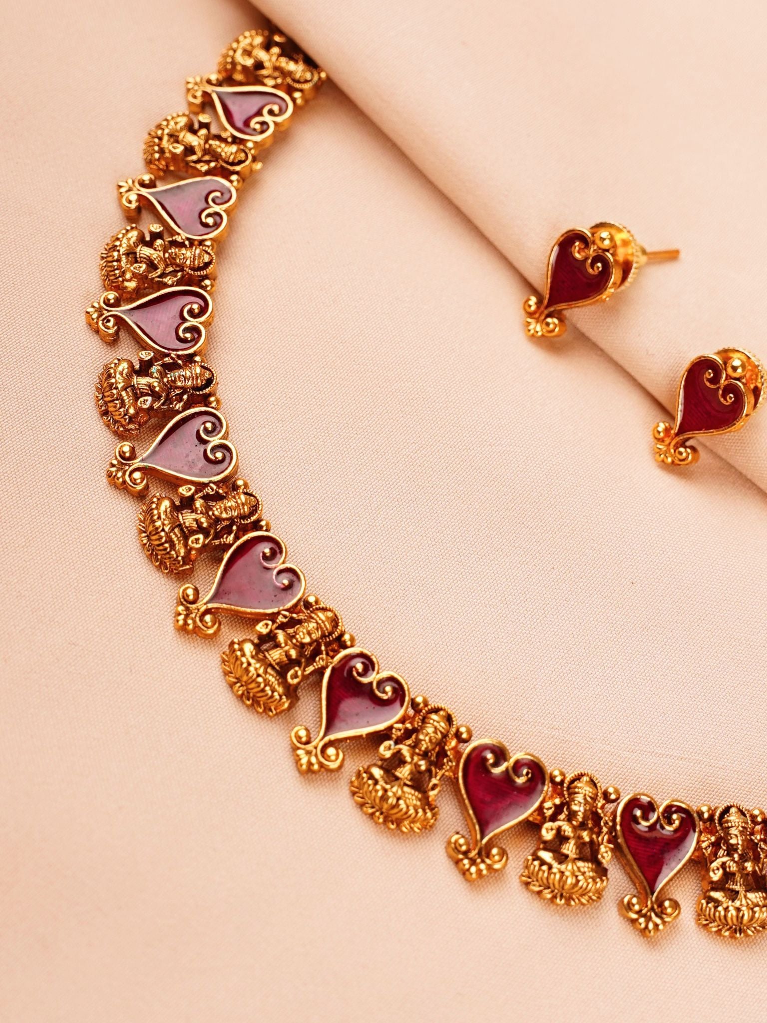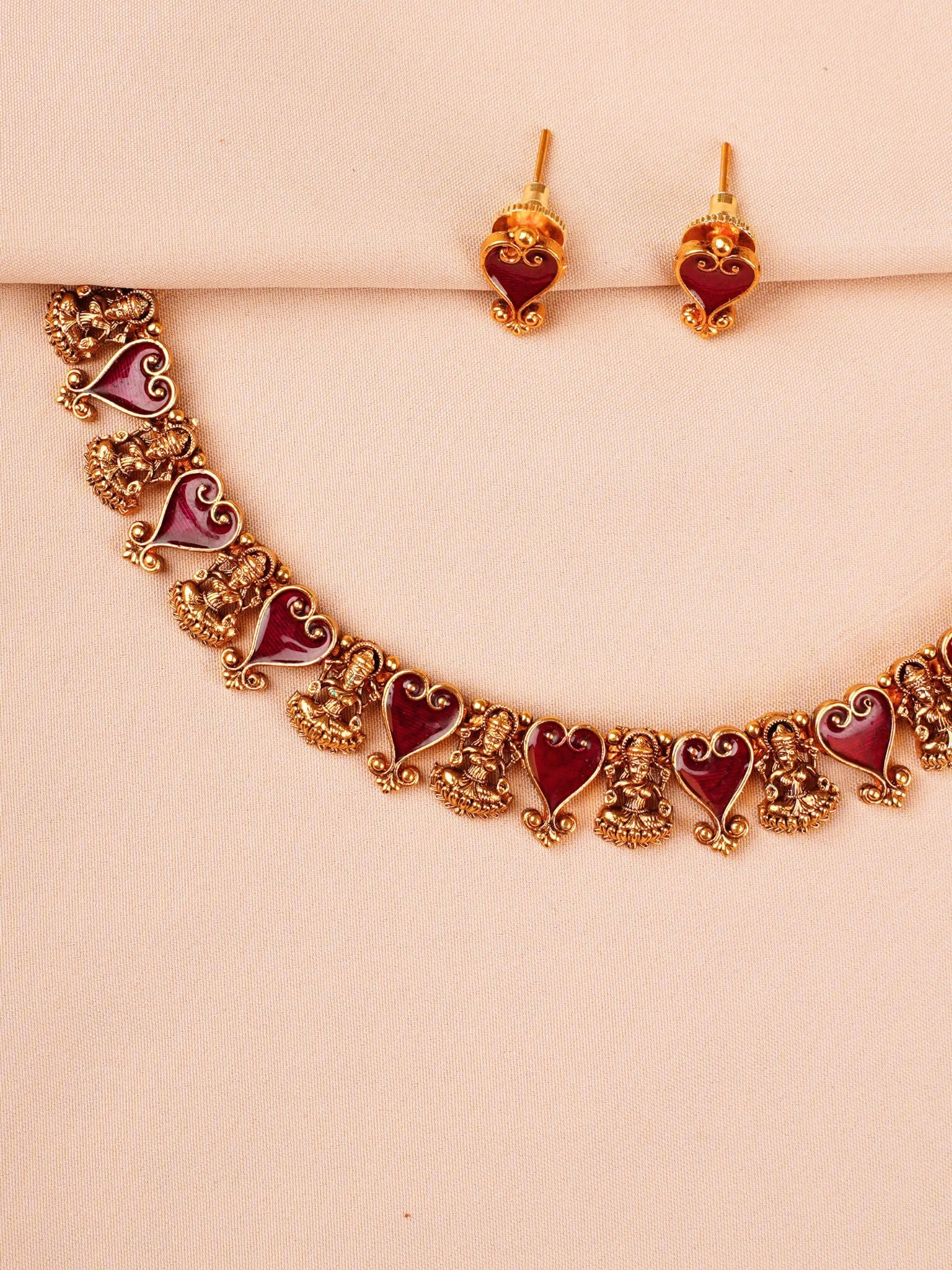 A classic temple jewellery creation inspired by divine beauty and traditional craftsmanship, this mat antique gold necklace set features intricately sculpted Lakshmi motifs paired with rich ruby-toned enamel heart-shaped elements. The harmonious combination of goddess figures and graceful curves symbolises prosperity, devotion, and feminine strength.