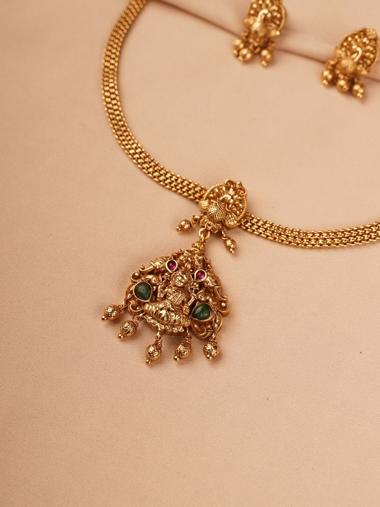 The necklace is designed with a rich multi-strand antique gold chain and finished with delicate traditional coin drops that add gentle movement and a classic temple jewellery charm. Subtle ruby pink and emerald green stone accents enhance the pendant’s detailing without overpowering its divine elegance.