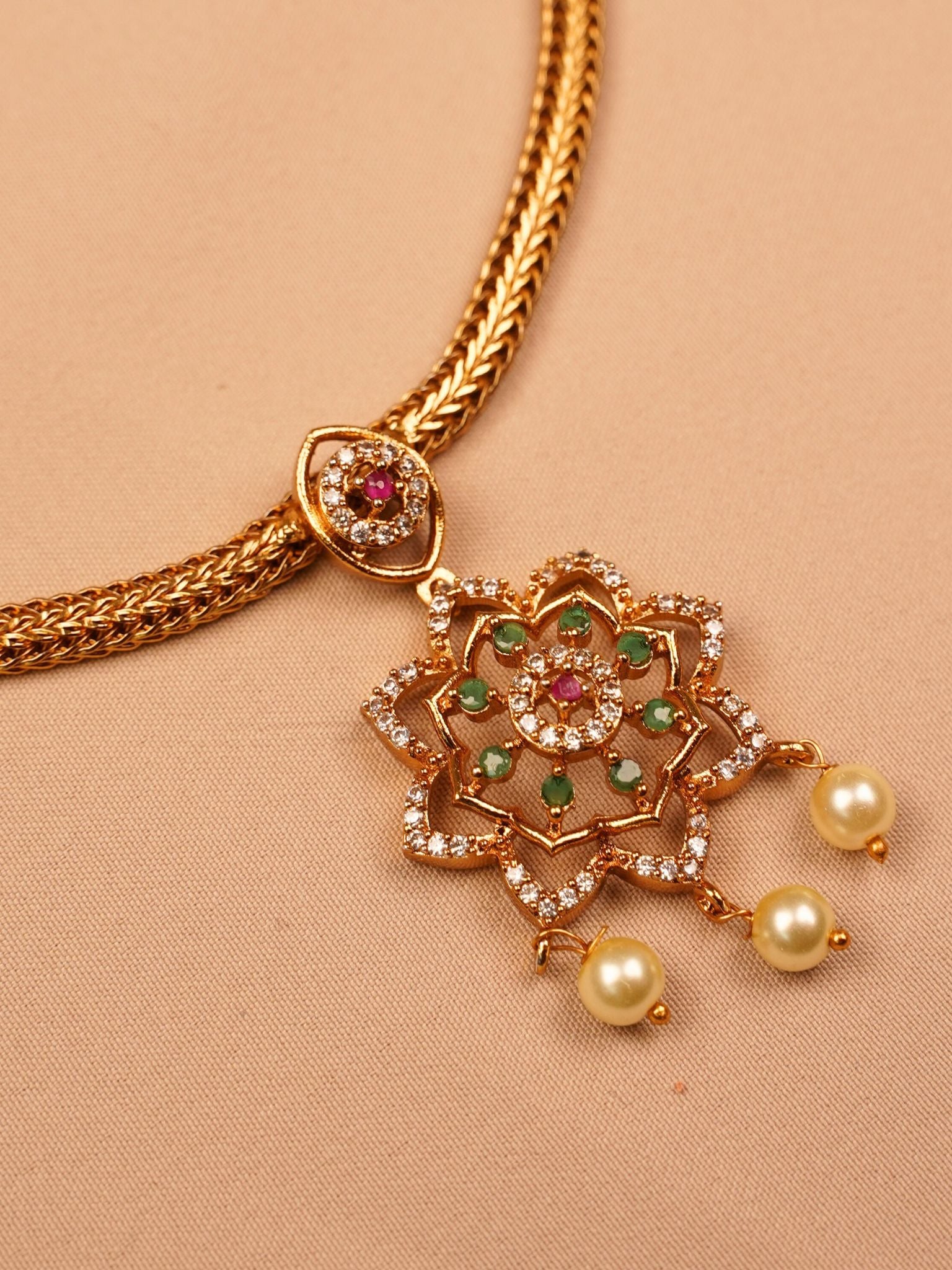 Crafted in an antique gold finish with a premium woven chain, this piece is a stunning pick for traditional occasions, silk sarees, receptions & temple ceremonies.