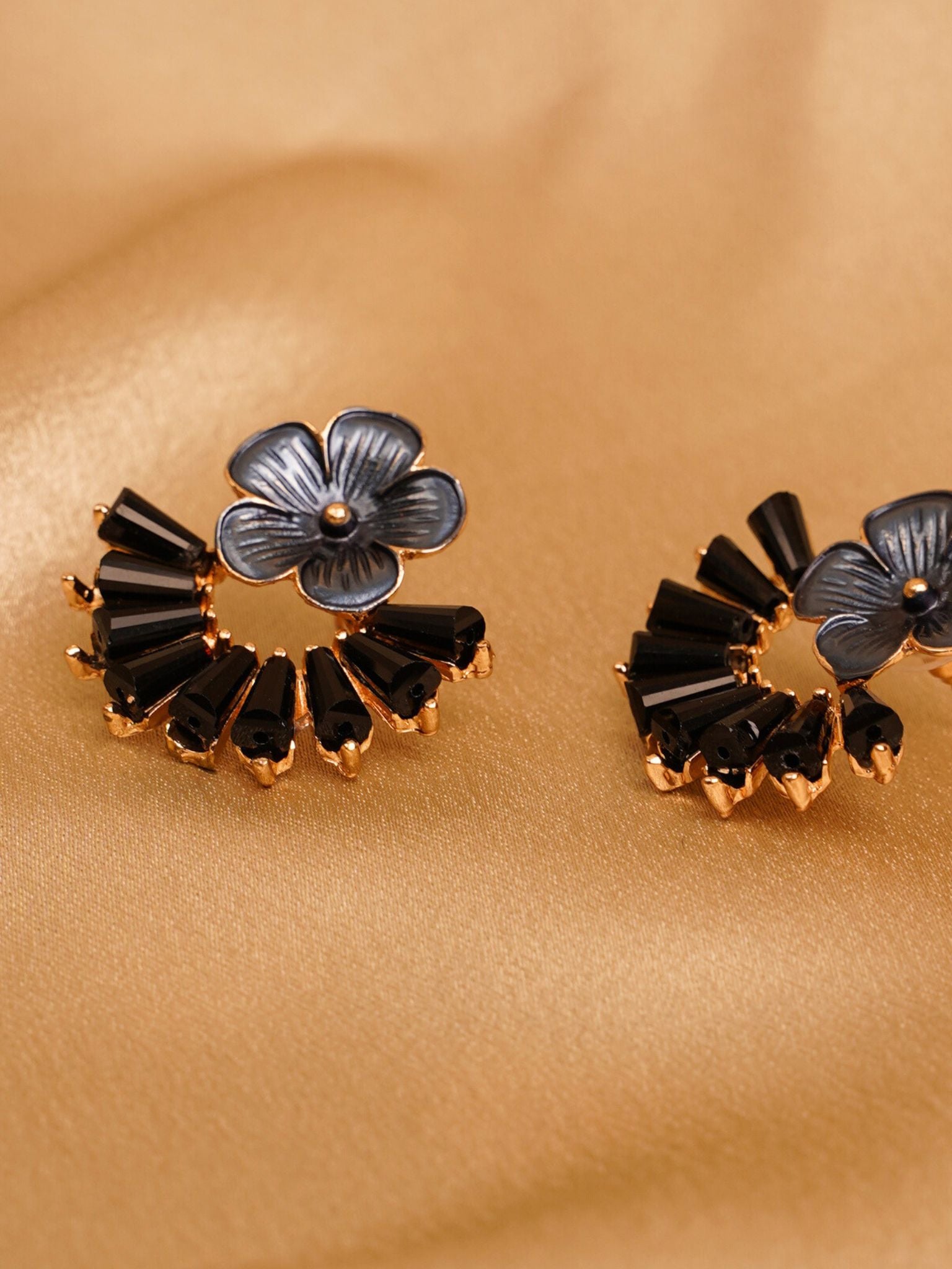 The Midnight Bloom Fan Earrings blend delicate florals with striking geometric elegance. Featuring a sculpted grey-blue flower at the top, the design flows into a semi-circular arrangement of sleek black crystal elements set in a gold finish.