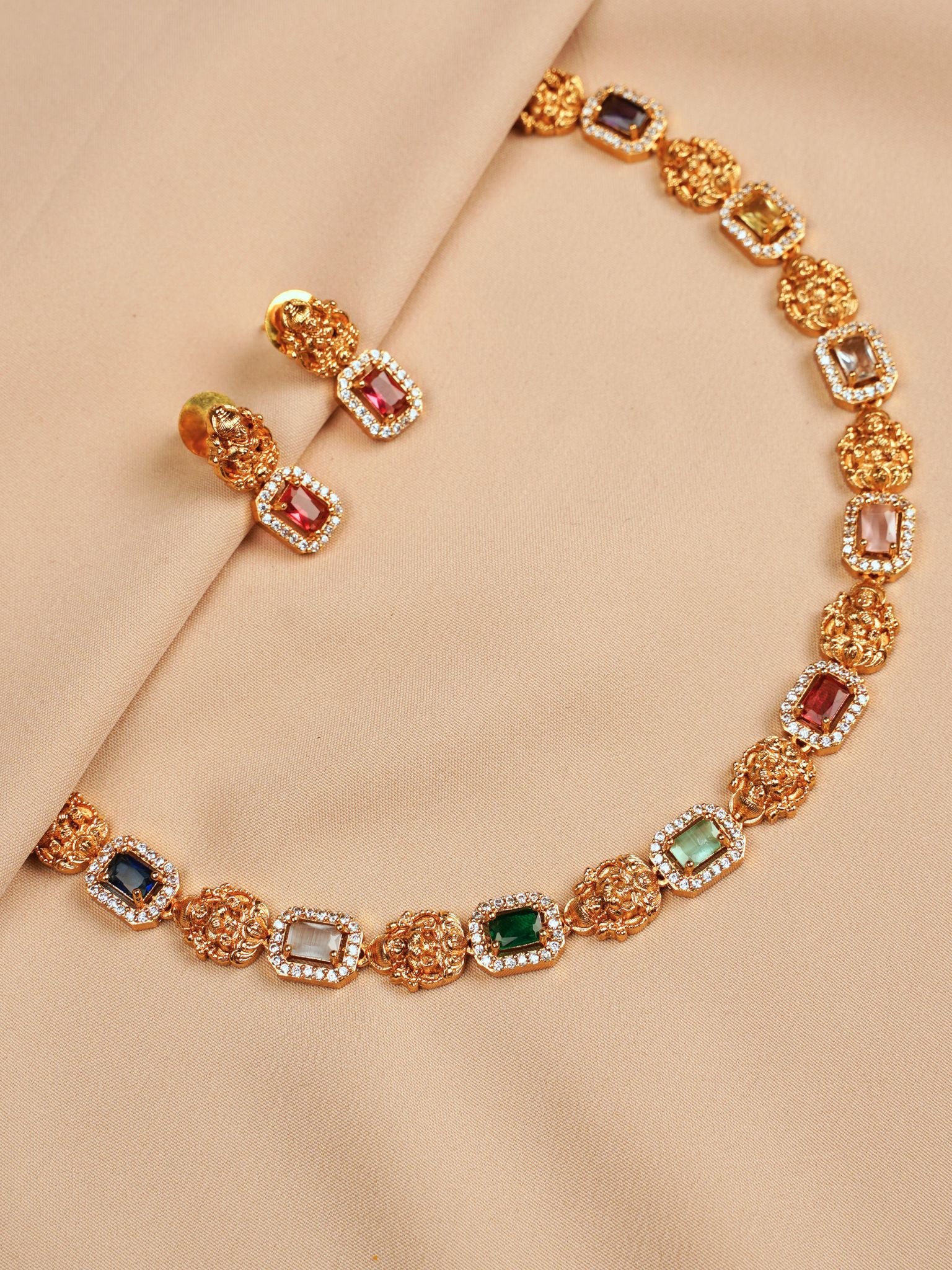 A stunning multi-stone gold-finish necklace set featuring vibrant emerald, ruby, sapphire, and pastel stones framed with shimmering AD crystals. Perfect for festive, bridal, and party looks.