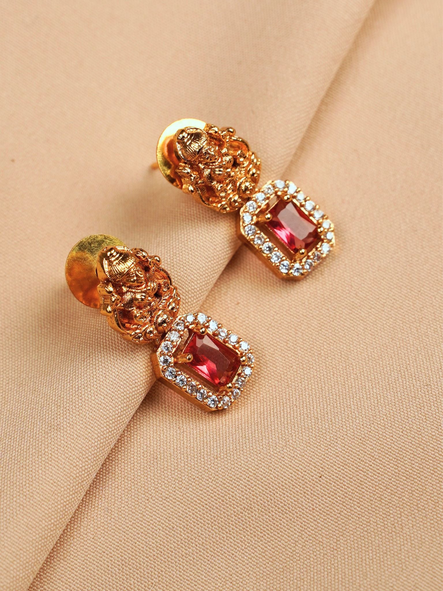 Gold-Toned Floral Stud Earrings with Ruby Center & CZ Detailing
