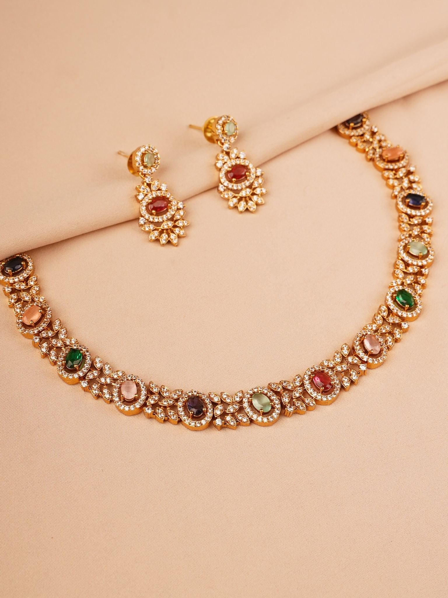 Paired with matching push-back drop earrings that echo the same stone pattern, this necklace set pairs effortlessly with gowns, cocktail sarees, festive outfits and elegant party wear. Ideal for receptions, celebrations, weddings and formal evenings.
