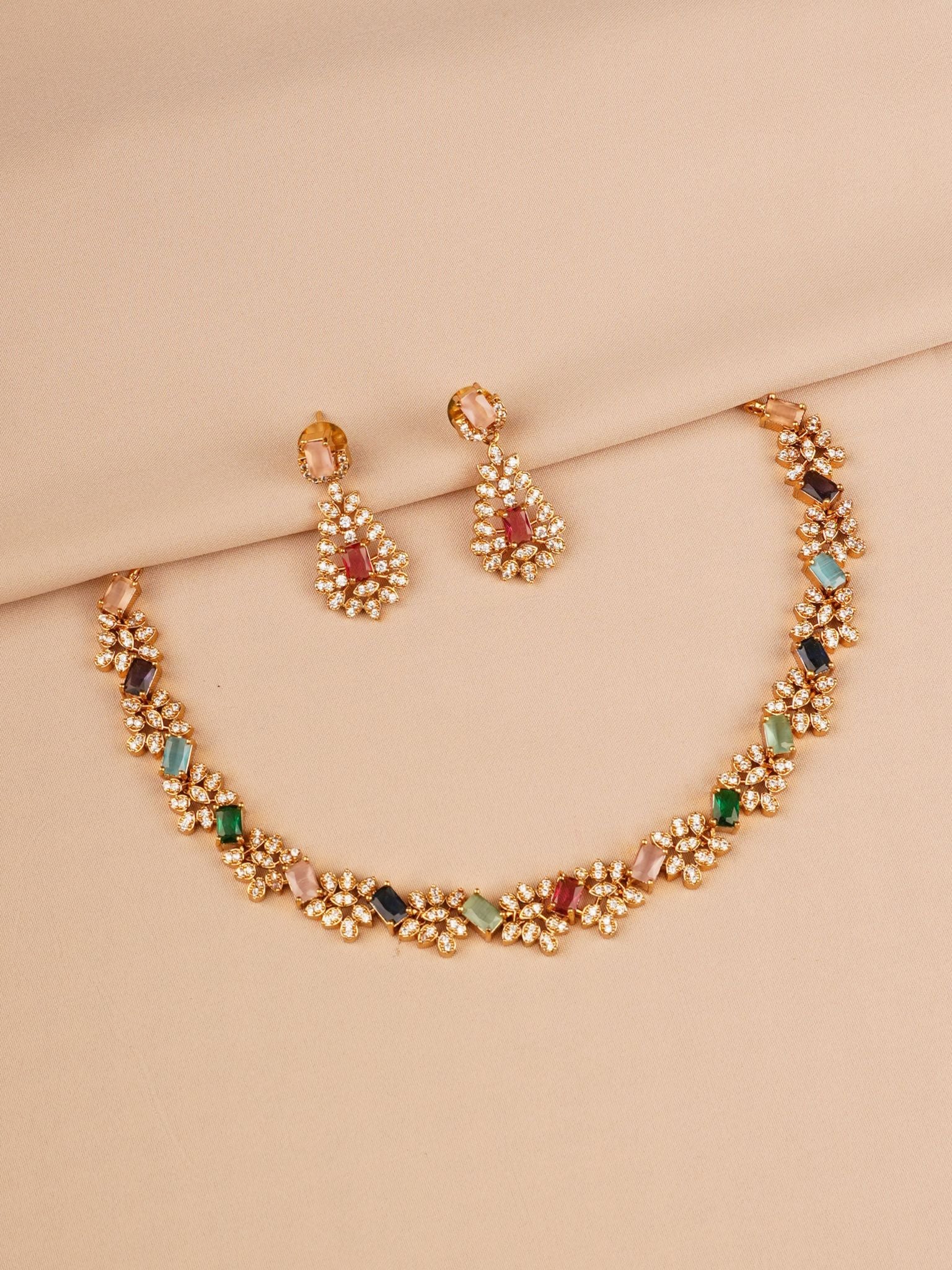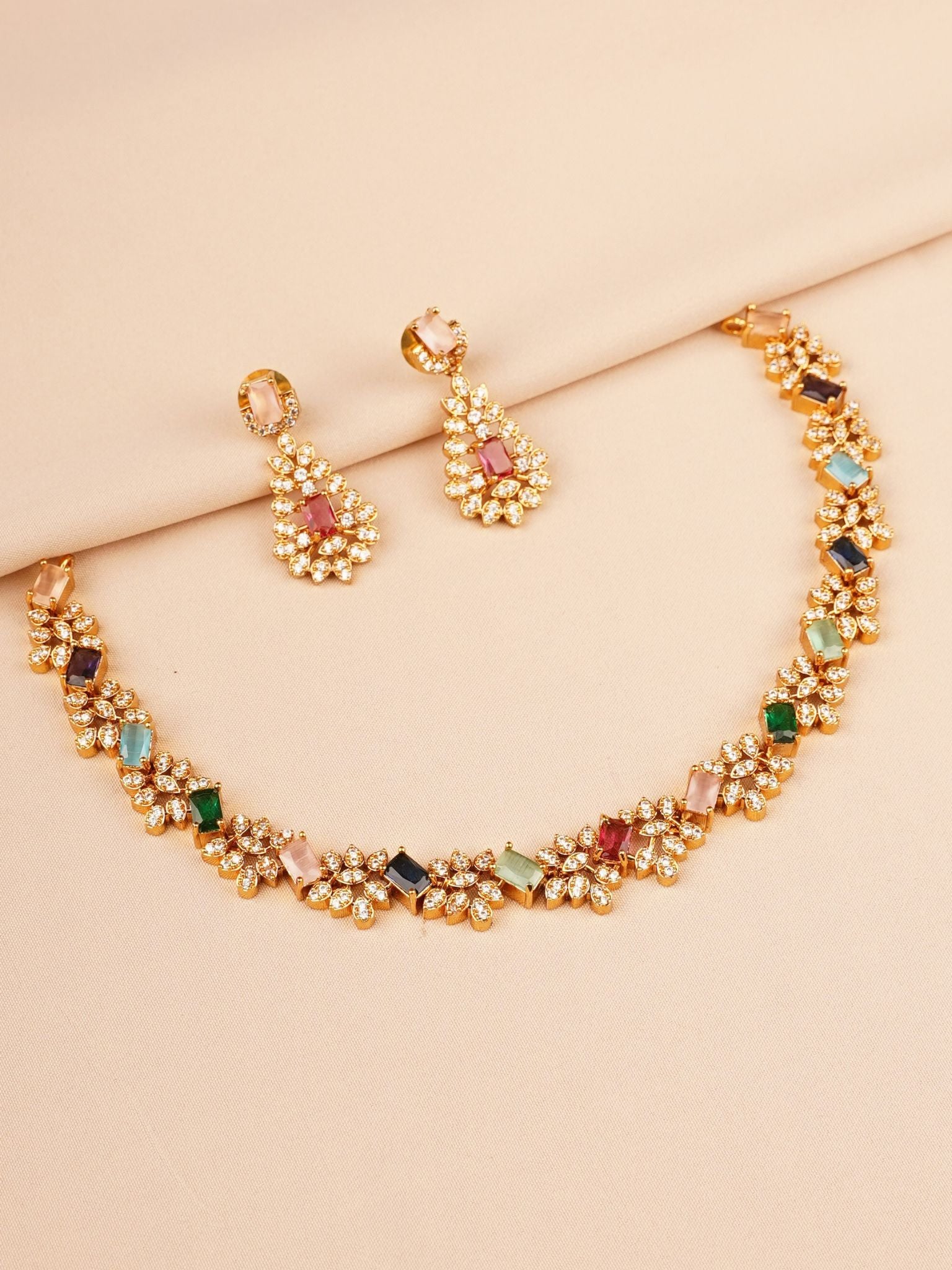 The floral-inspired crystal clusters are interlinked with rectangular pastel stones, creating a graceful flow of colour across the neckline. The matching earrings follow the same teardrop pastel stone and crystal halo design, adding a refined finish to the look.