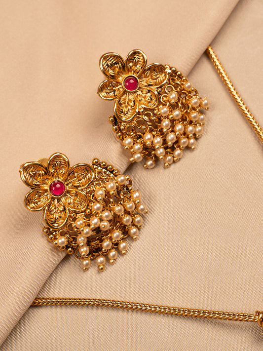 Floral Antique Gold Pendant Set with Pearl Drops
