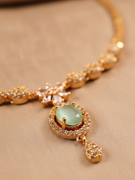 Elegant Gold Necklace with Lime Green Stone Pendant & White CZ Detailing