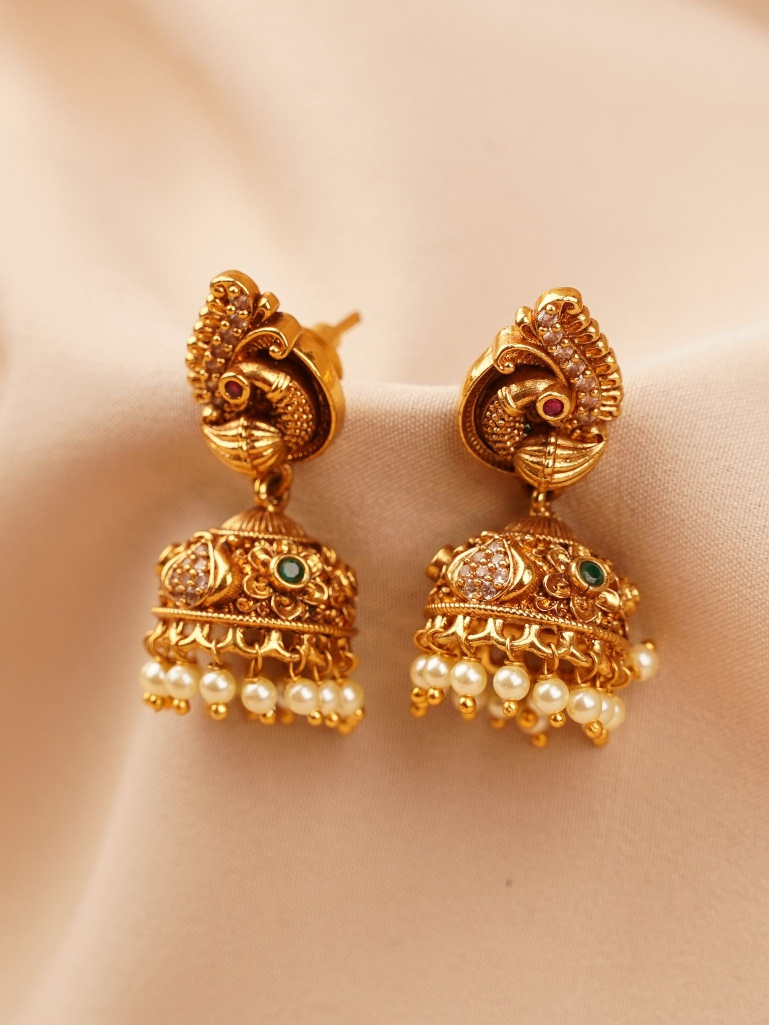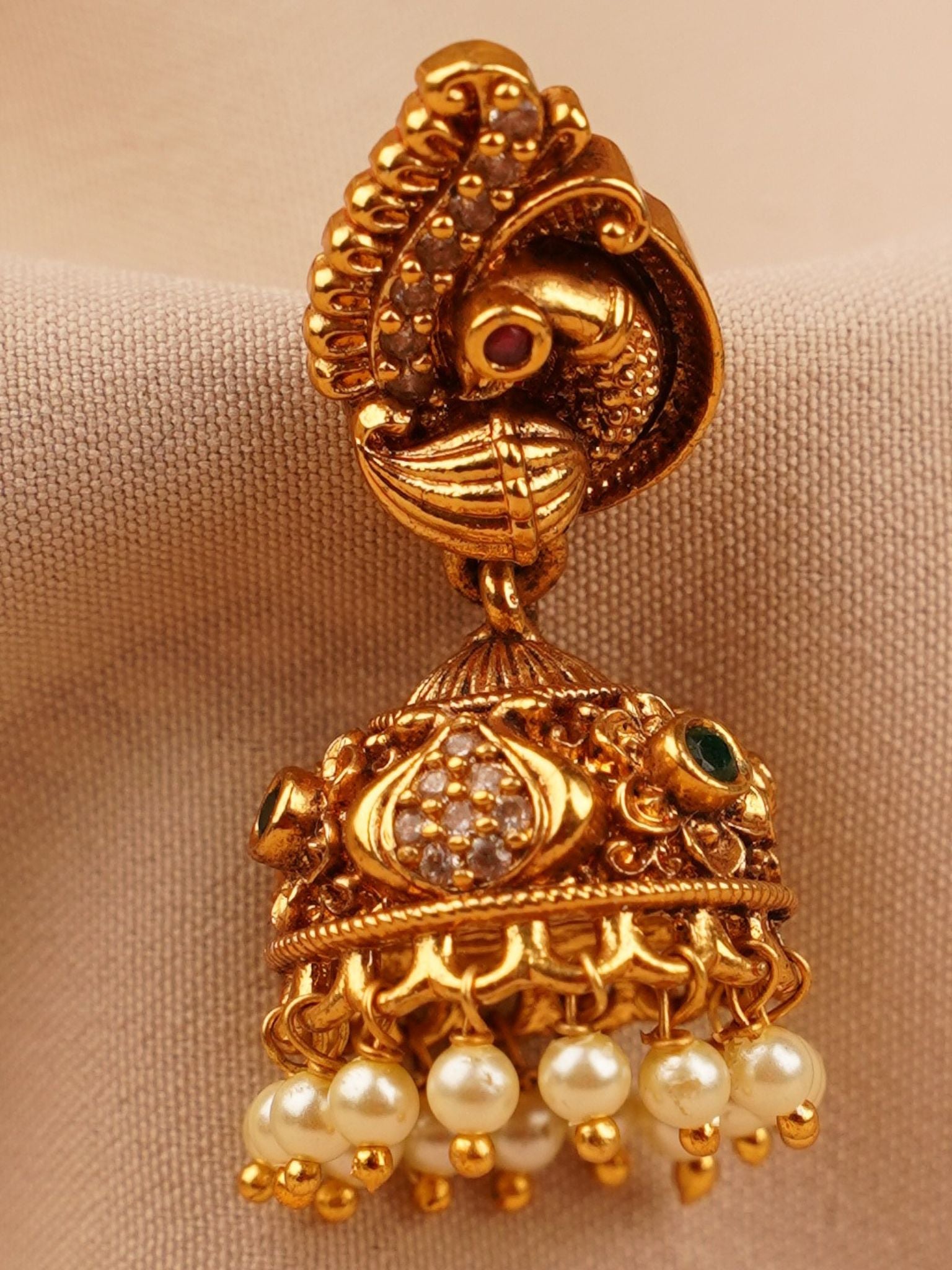 Peacock Temple Jhumka Earrings with Pearl Drops