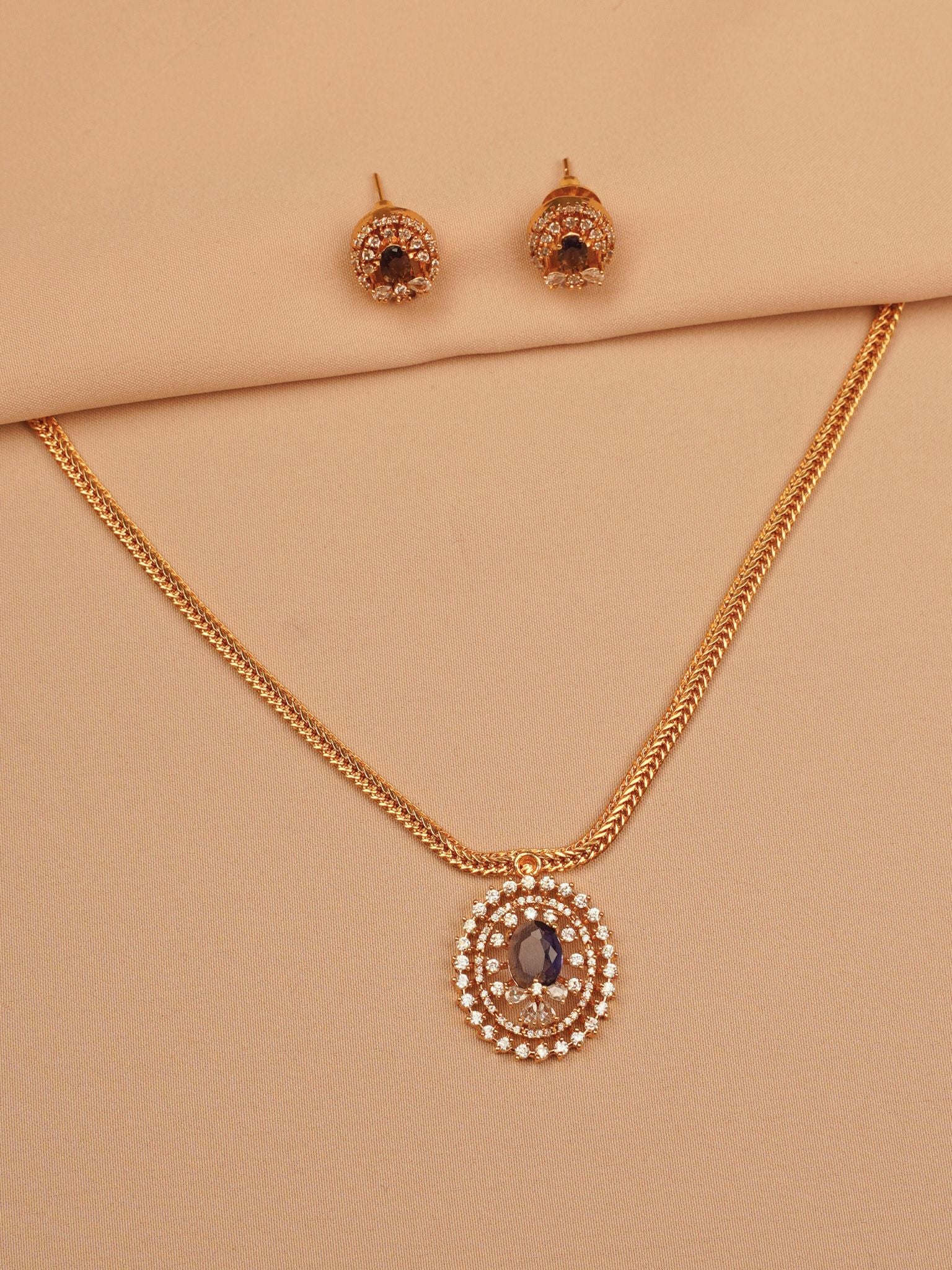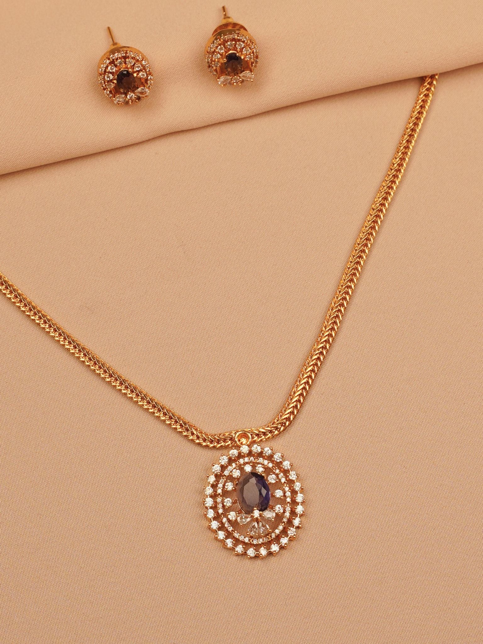 The Chocolate Crystal Halo Necklace Set features a beautiful cocoa-brown centerpiece stone framed by brilliant CZ crystals in a round halo design. The rich gold polish enhances its luxurious look, making it perfect for festive nights, parties, and gifting moments.