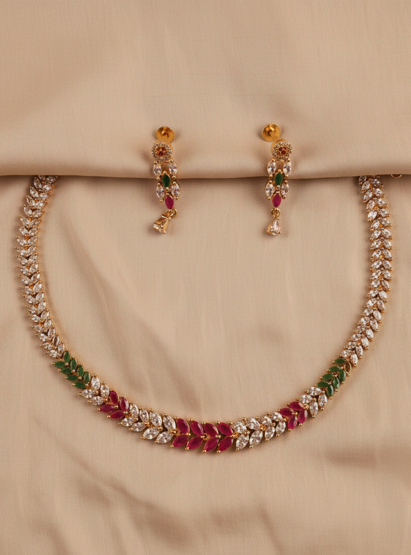 Elevate your look with this exquisite necklace and earring set from Kaithra. Crafted with precision, this beautiful jewelry set features dazzling white, red, and green stones in a striking leaf motif, complemented by intricate gold-plated detailing. The lightweight design ensures comfort, making it perfect for weddings, festive events, or adding a touch of elegance to your daily style. Whether paired with ethnic or modern outfits, this set brings timeless charm and sophistication to any ensemble. Includes one necklace and a matching pair of earrings. Avoid exposure to water and perfumes for lasting shine.