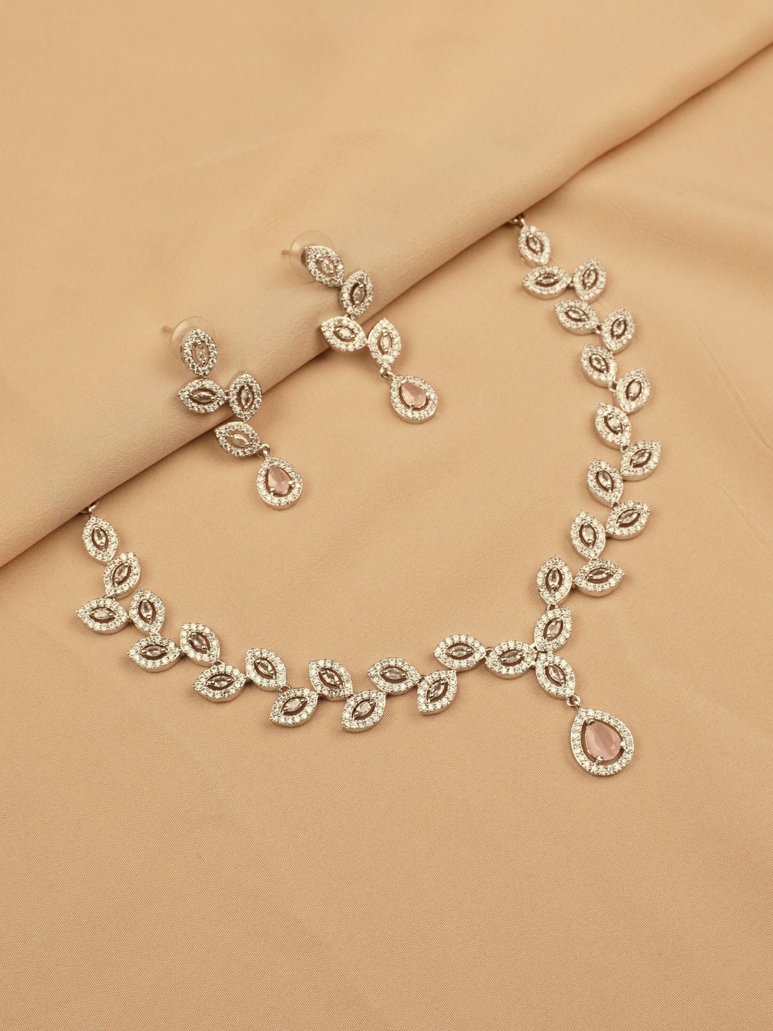 Embrace elegance with this beautiful rose gold-plated necklace set, designed with delicate leaf motifs studded with sparkling crystals and blush pink stones. The graceful design features an intricate arrangement of marquise-shaped elements and a stunning drop pendant, complemented by matching earrings. Ideal for weddings, parties, and festive occasions, this refined jewelry set adds a soft, sophisticated charm to your ethnic ensemble.