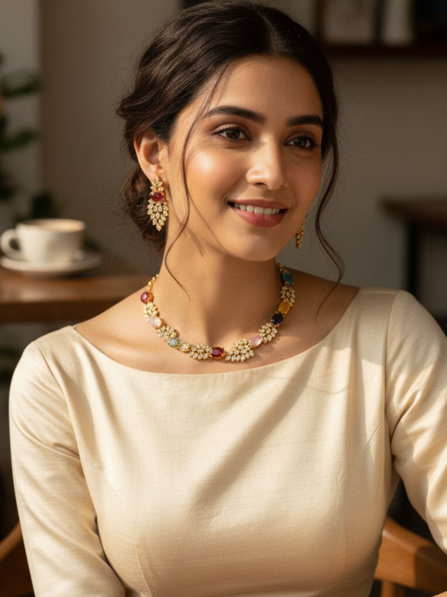Elevate your elegance with this exquisite Royal Navaratna Necklace Set, a timeless blend of tradition and sophistication. Crafted with radiant American diamonds and embellished with nine vibrant semi-precious Navaratna stones, this gold-plated set includes a beautifully coordinated pair of earrings. Each stone is intricately surrounded by sparkling diamond clusters, making it the perfect choice for weddings, festivals, or grand celebrations. Let every occasion shine with divine color and charm.