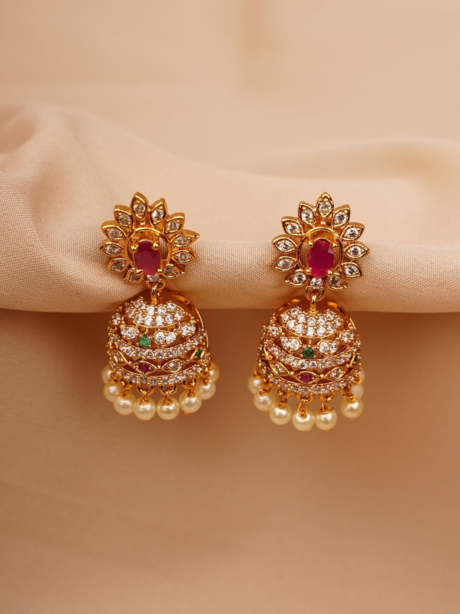 Classic Gold Jhumka Earrings with Pearl Drops & CZ Stones