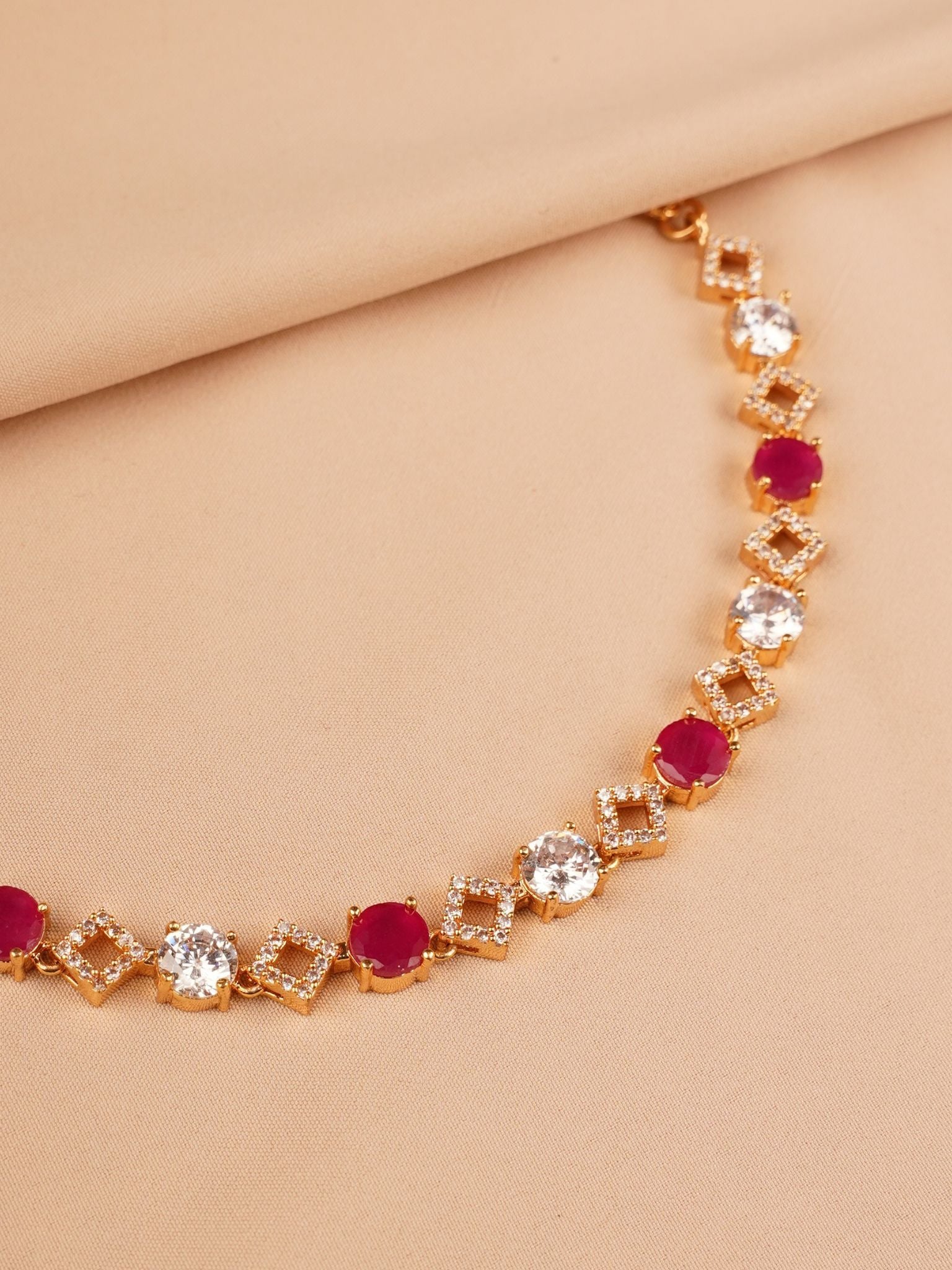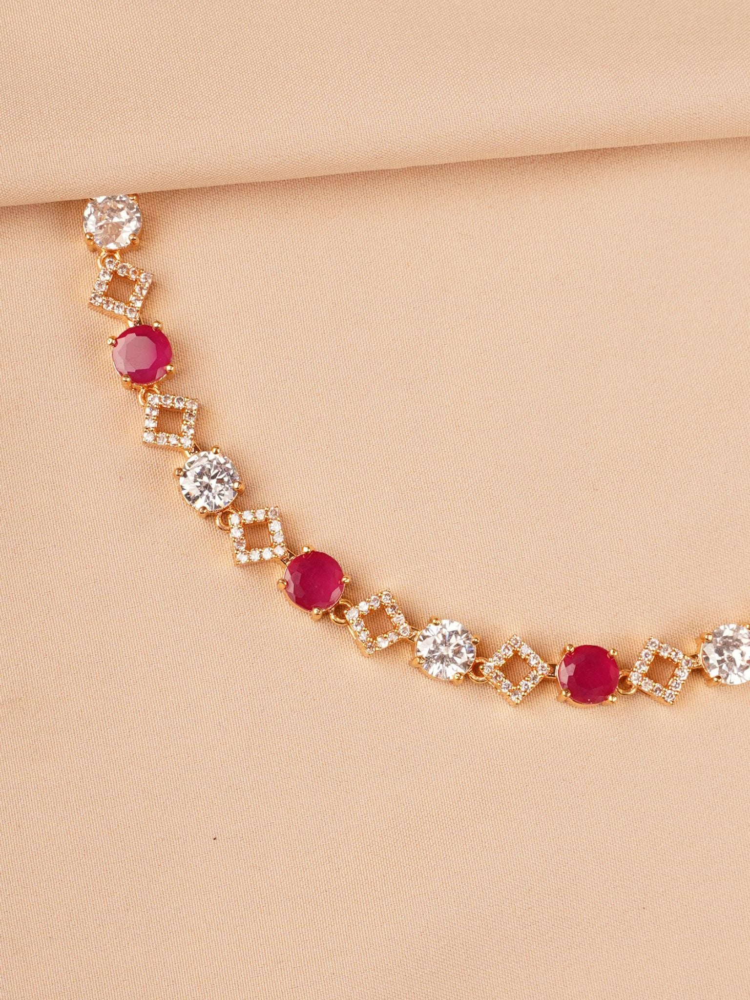 A refined expression of subtle elegance, this gold finish necklace features a delicate sequence of ruby red round-cut stones interlinked with shimmering clear crystal accents and geometric open-square elements.
