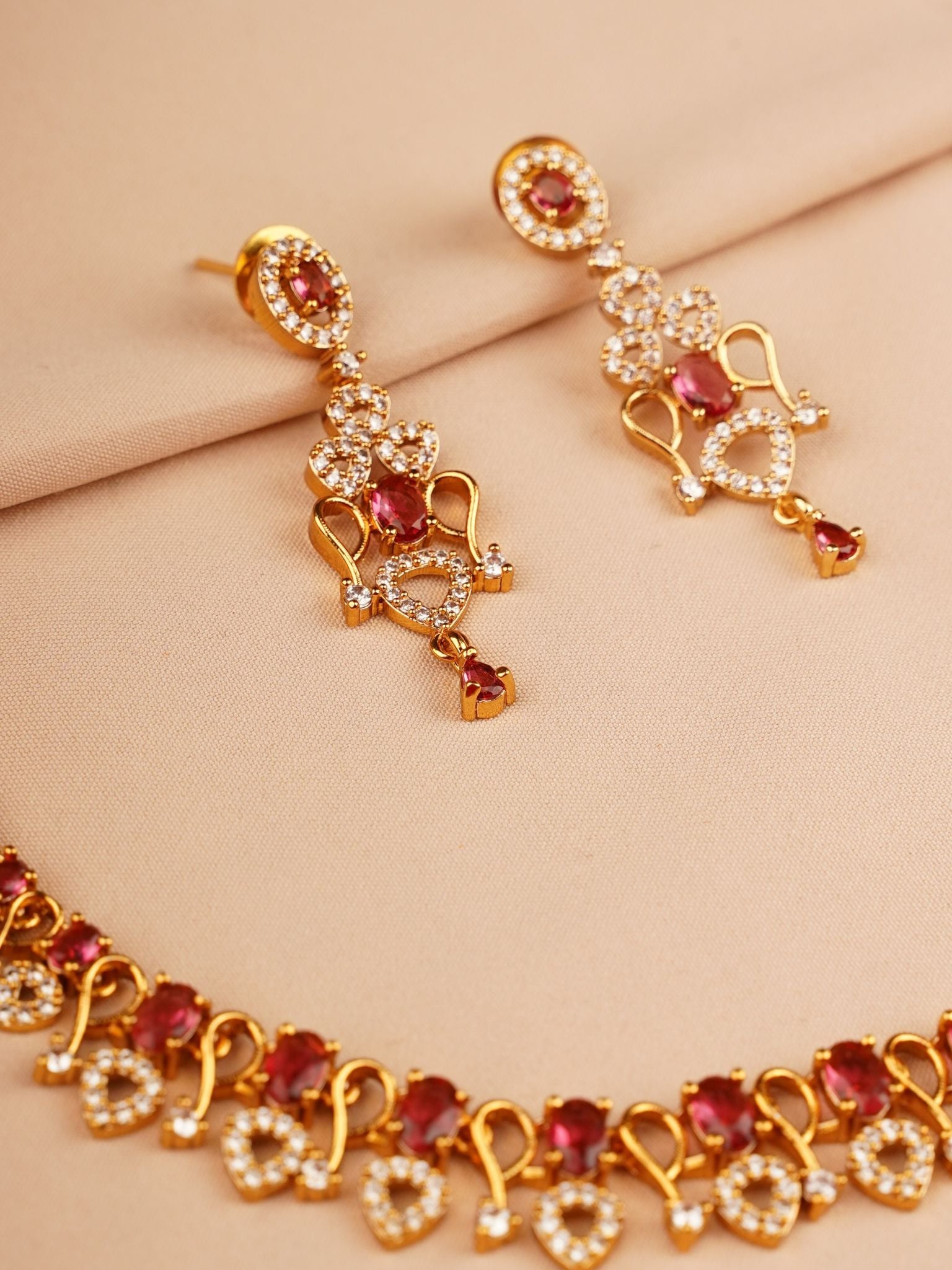 The Ruhani Ruby Necklace Set is a graceful blend of soft romance and timeless elegance. Featuring delicate ruby-toned stones set in an intricate gold framework, the necklace is finished with floral crystal motifs that add a gentle sparkle. The matching earrings mirror the same refined detailing with a subtle drop, creating a perfectly balanced, elegant look.