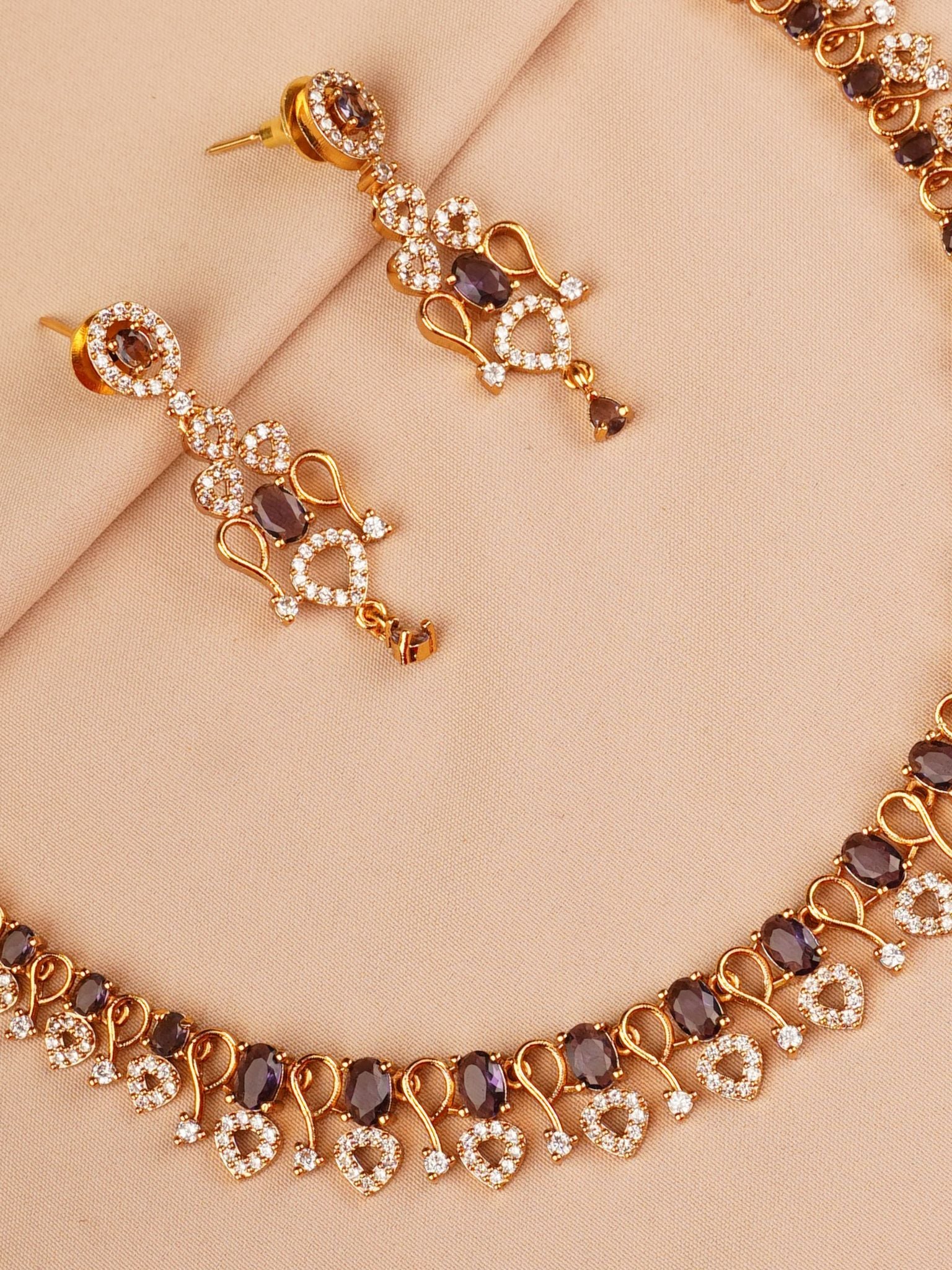 The Smoky Amethyst Grace Necklace Set blends muted purple tones with soft gold and crystal brilliance for an elegant, refined look. The necklace features a continuous line of amethyst-hued stones framed by delicate heart-shaped crystal motifs, creating a rhythmic sparkle across the neckline.