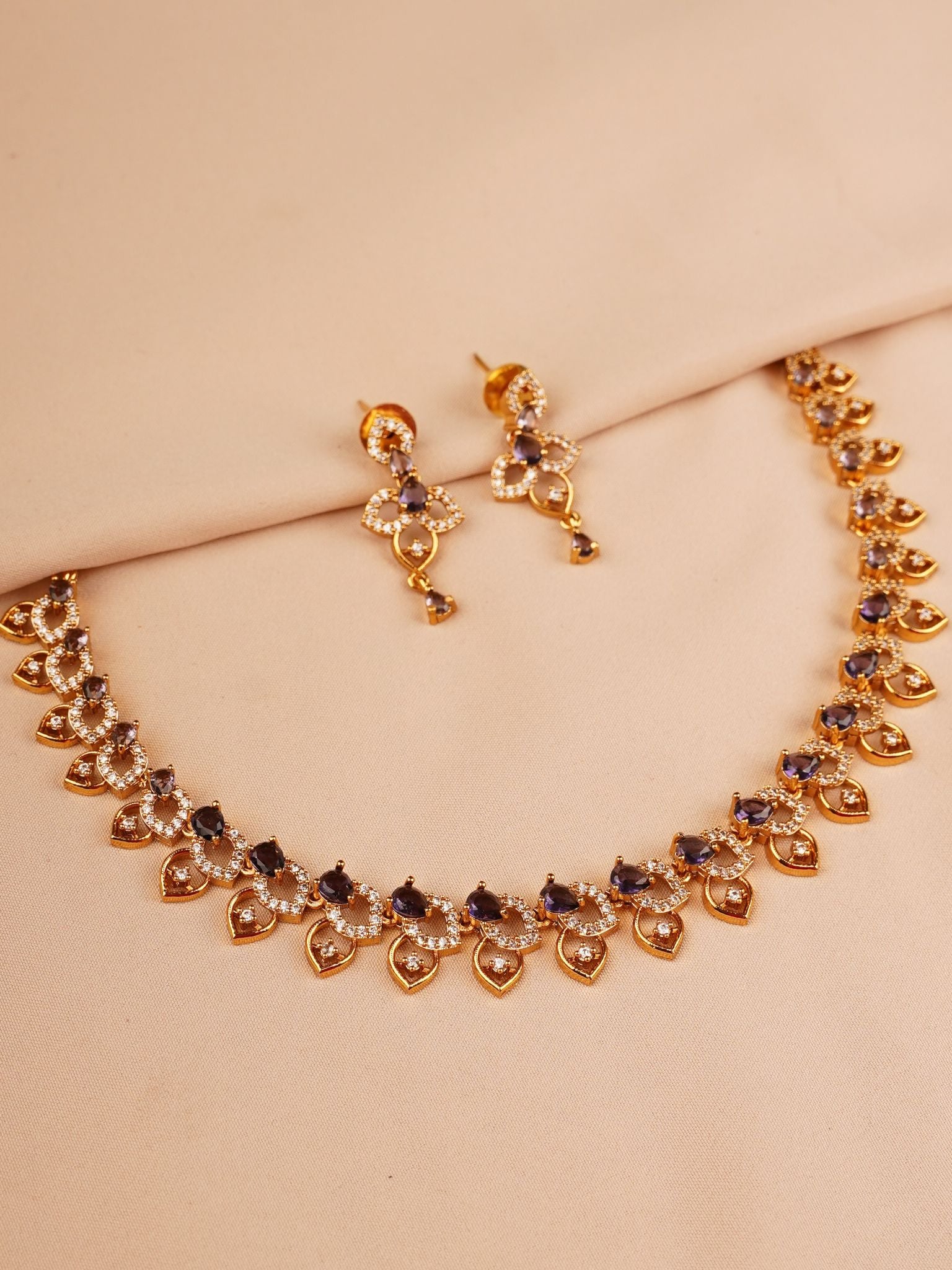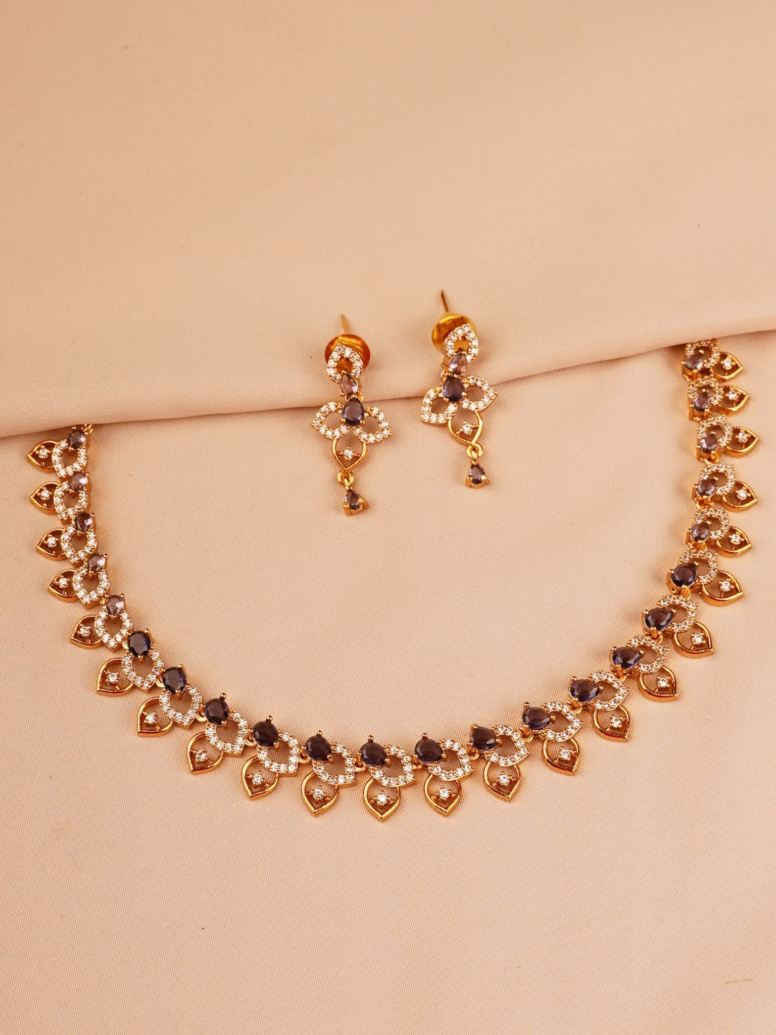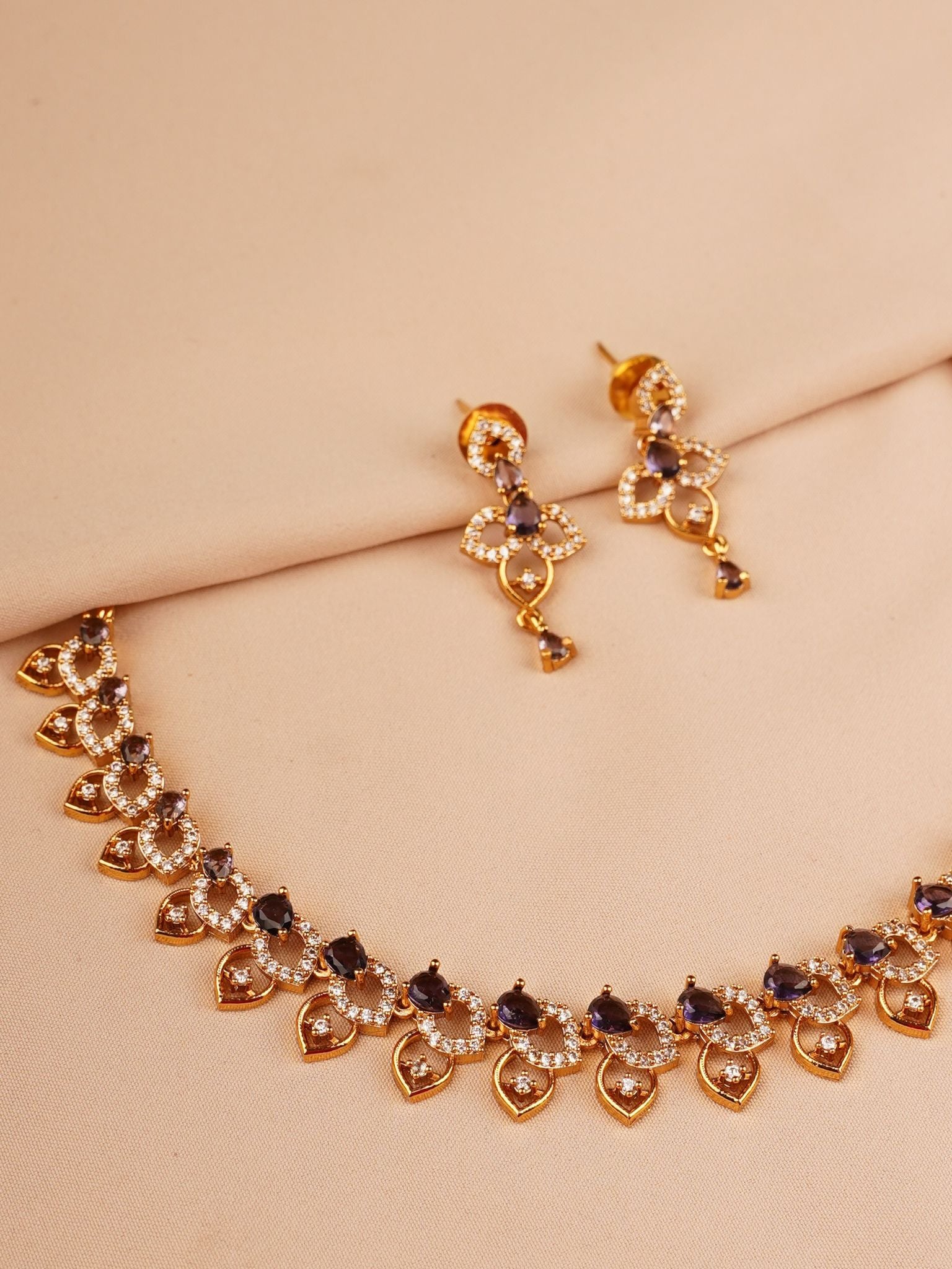 The matching earrings mirror the same heart-and-drop detailing, giving a delicate movement and soft shimmer that elevates the entire look without overpowering it. This is a set made for women who love understated luxury and refined elegance.